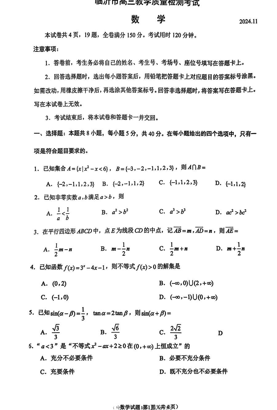 山东临沂2025届高三上学期11月期中质检数学试题及答案