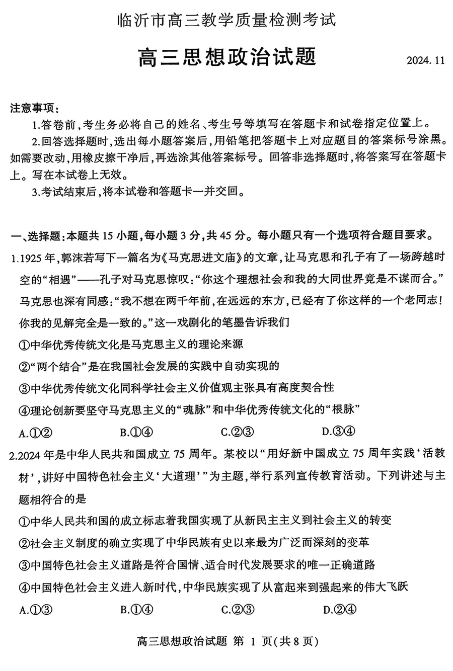 山东临沂2025届高三上学期11月期中质检政治考试已于近日开考,为方便考生考后及时查看考试情况,查漏补缺、弥补不足,本文整理了试题答案解析相关信息!
