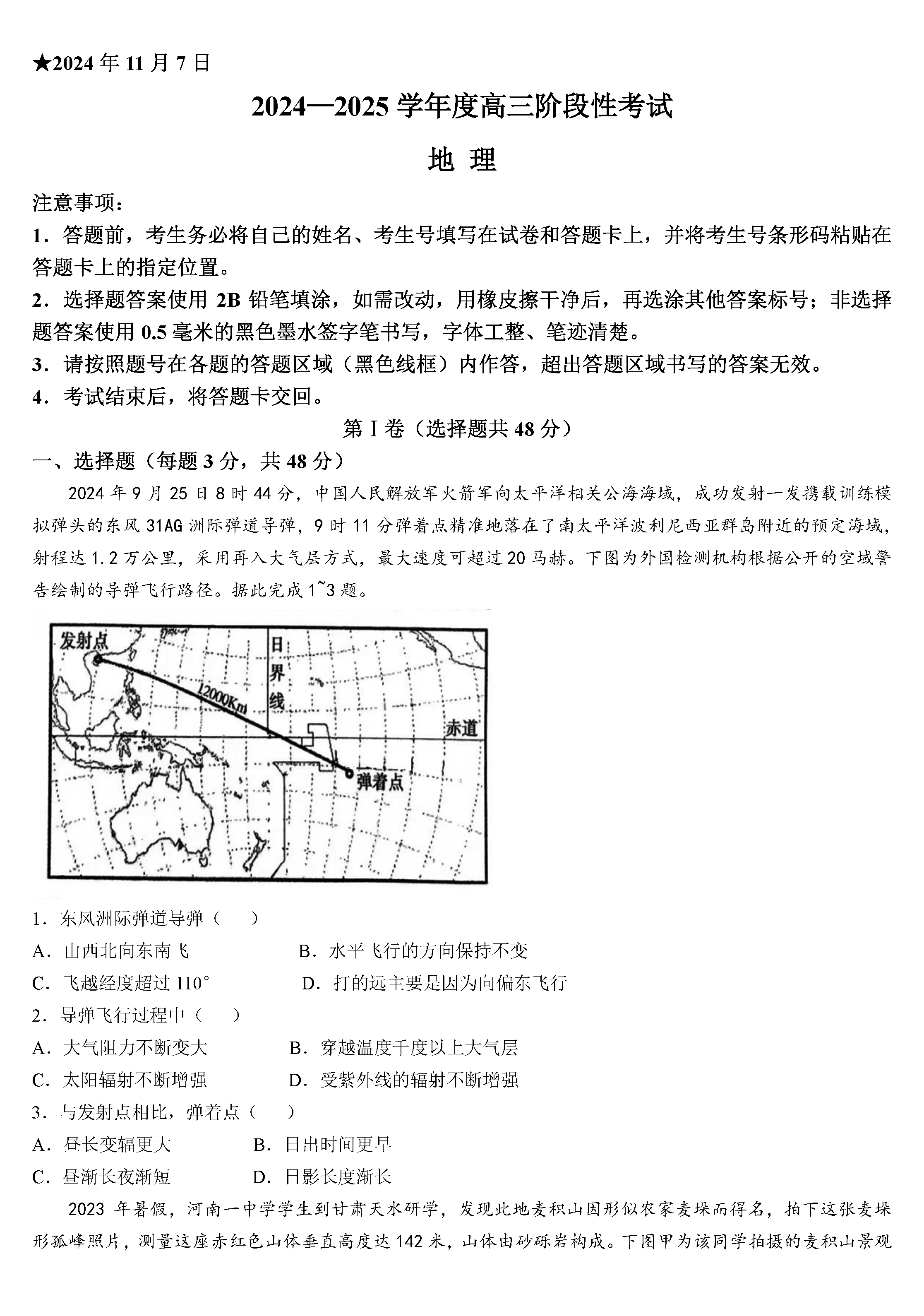 河南三门峡2024-2025学年高三上学期11月期中地理试题及答案