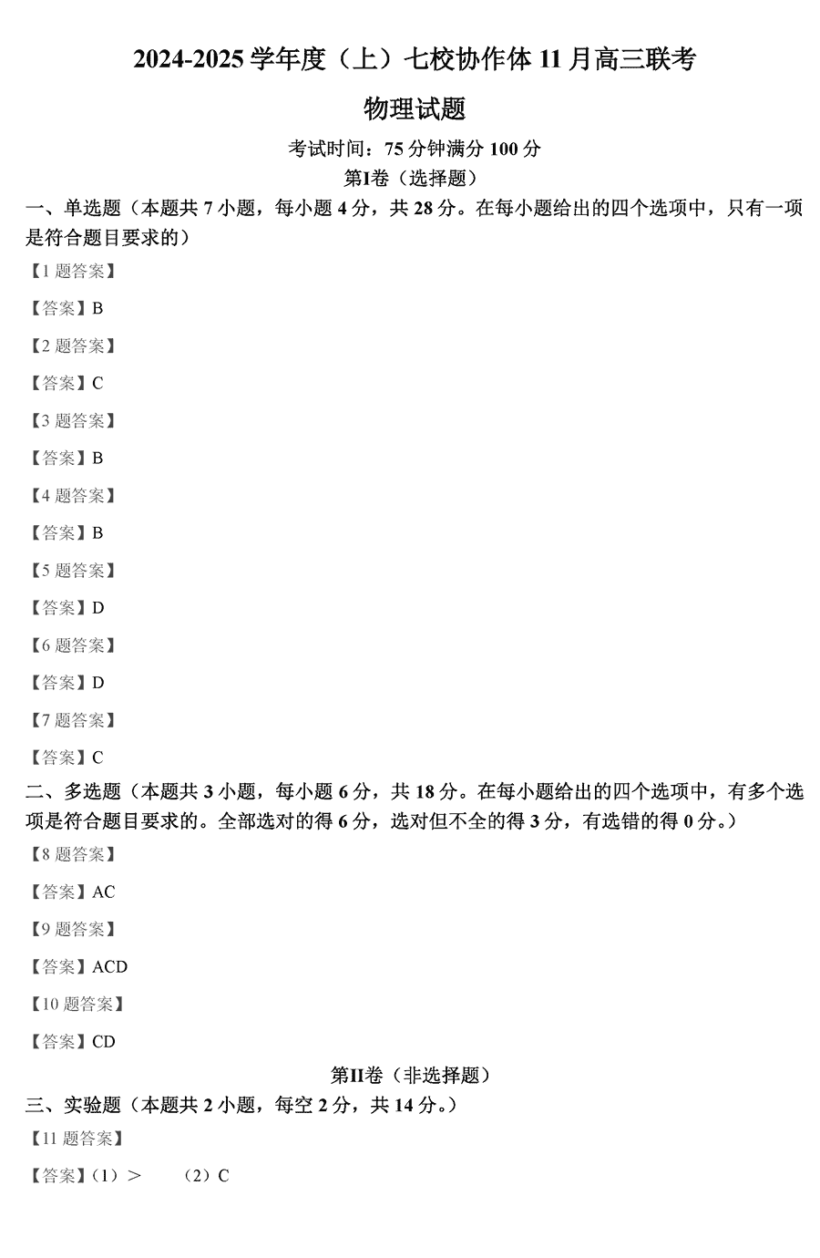 辽宁七校协作体2024-2025学年高三上学期11月期中联考物理考试已于近日开考,为方便考生考后及时查看考试情况,查漏补缺、弥补不足,本文整理了试题答案解析相关信息!