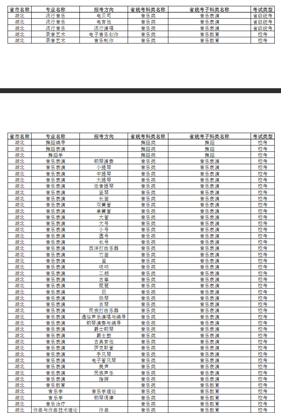武汉音乐学院2025年普通本科招生专业和各省统考子科类对照表