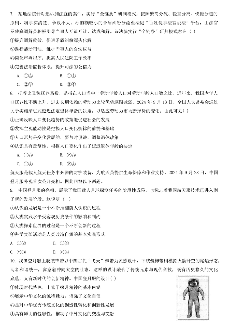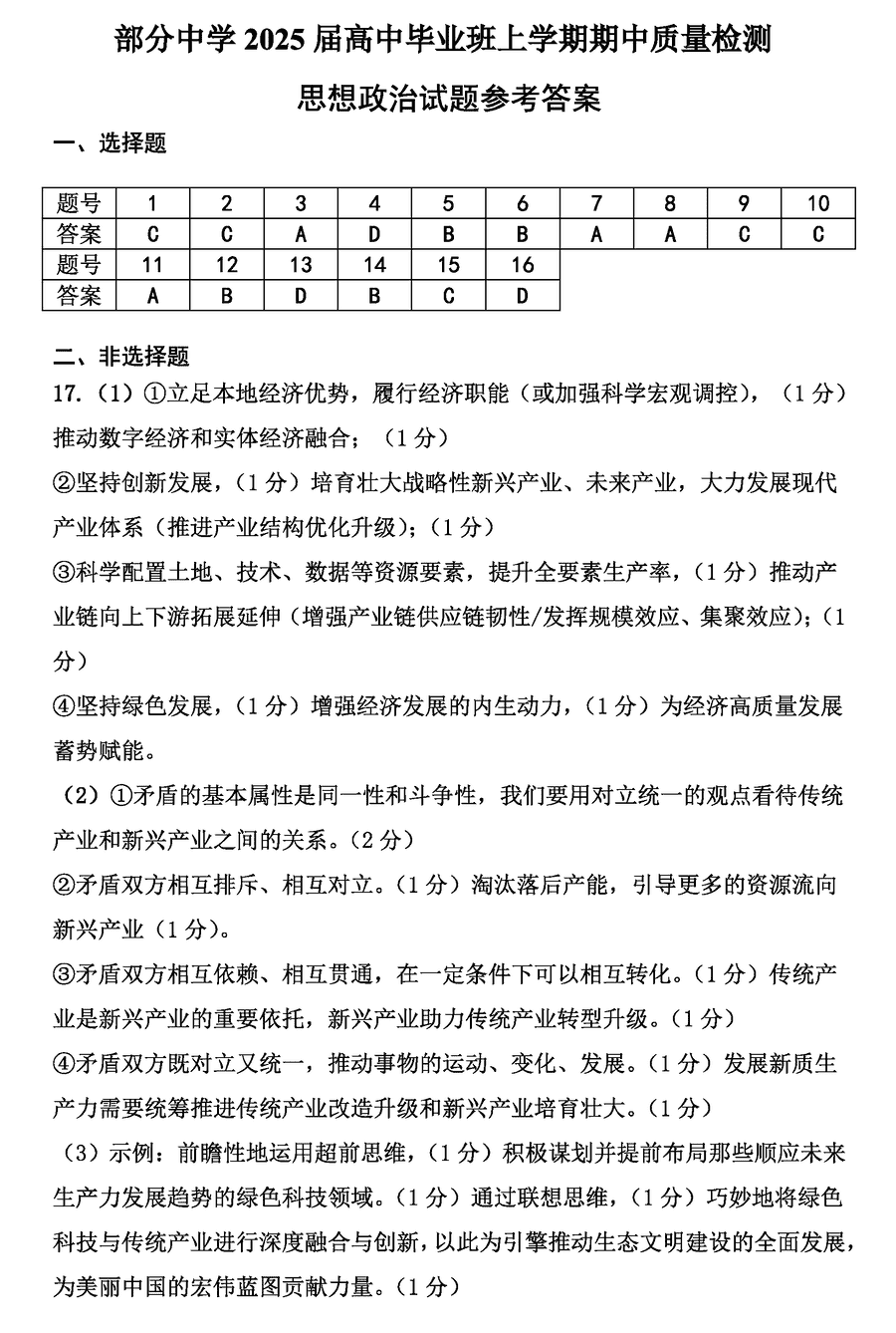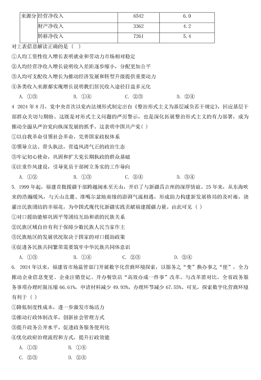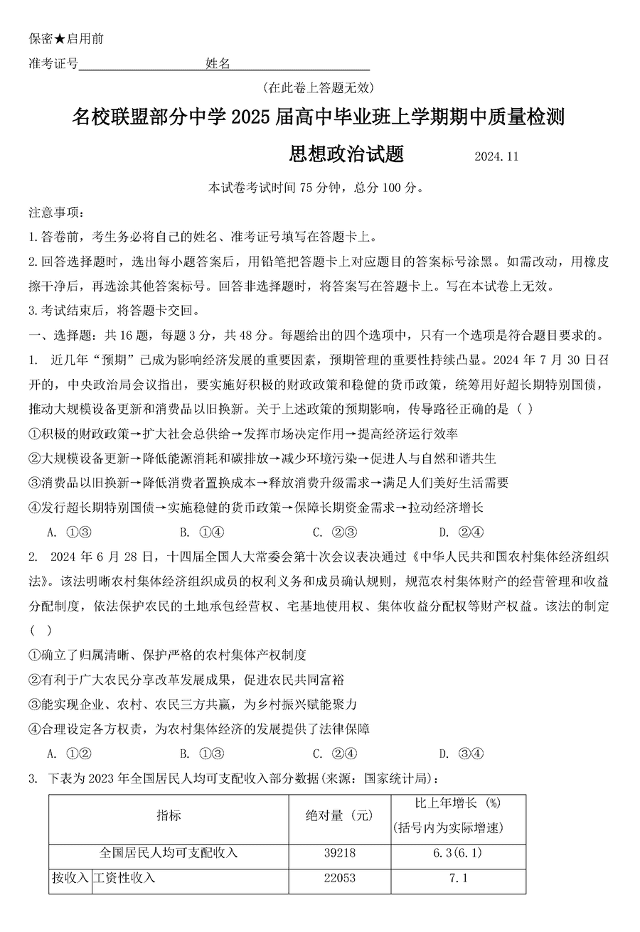 福建名校联考2025届高三11月期中质检政治试题及答案
