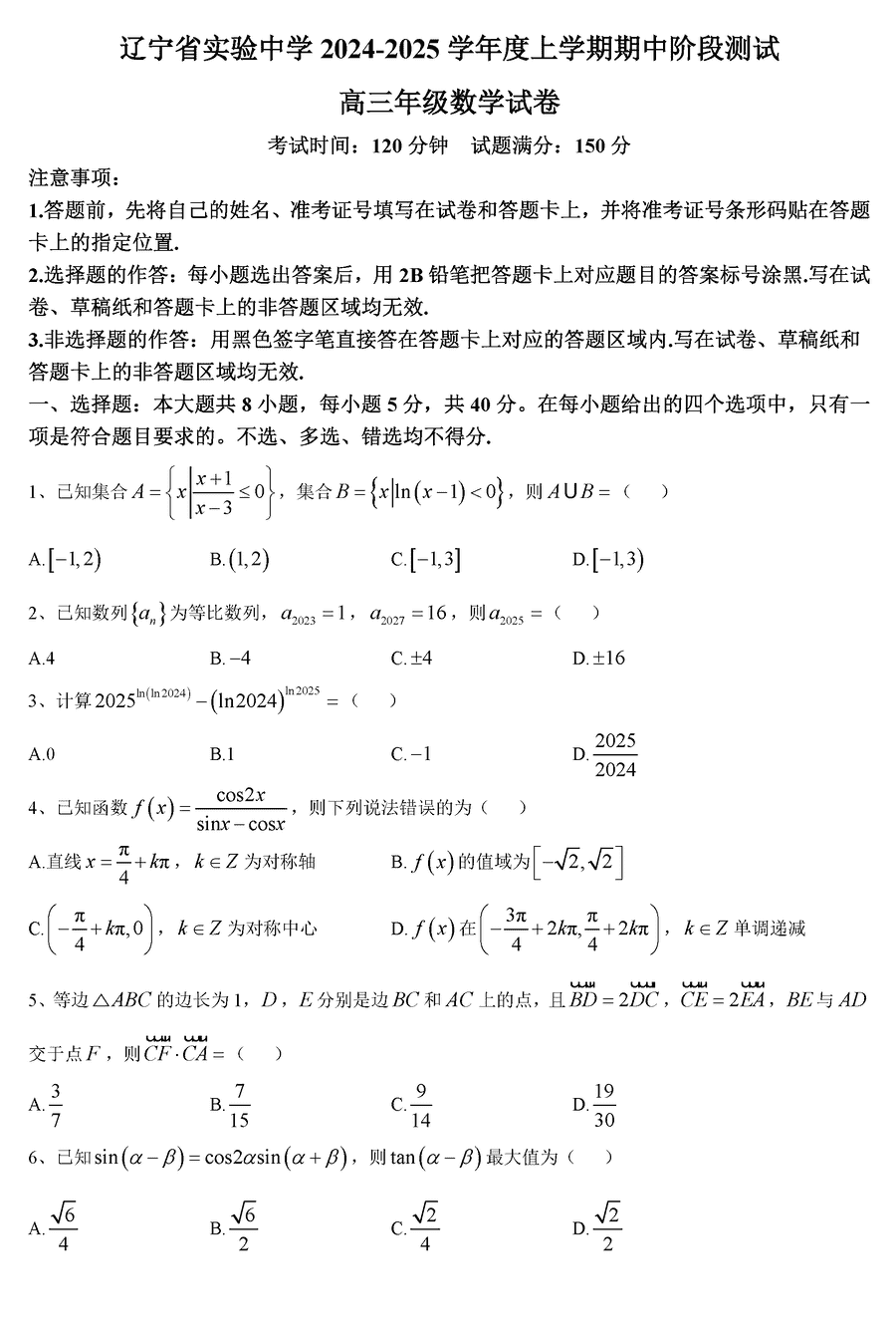 辽宁省实验中学2024-2025学年高三上学期期中数学考试已于近日开考,为方便考生考后及时查看考试情况,查漏补缺、弥补不足,本文整理了试题答案解析相关信息!