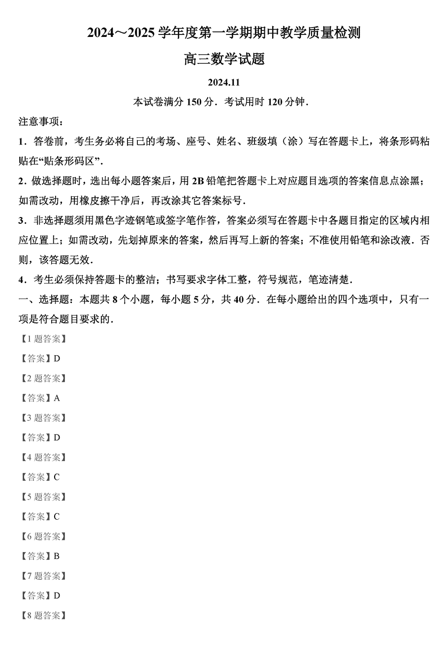 山东济宁2024-2025学年高三上学期期中数学考试已于近日开考,为方便考生考后及时查看考试情况,查漏补缺、弥补不足,本文整理了试题答案解析相关信息!