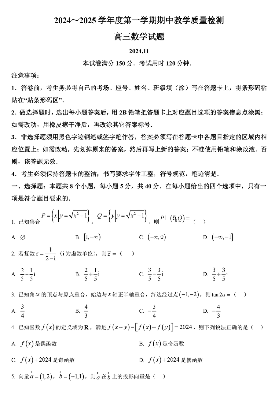 山东济宁2024-2025学年高三上学期期中数学试题及答案