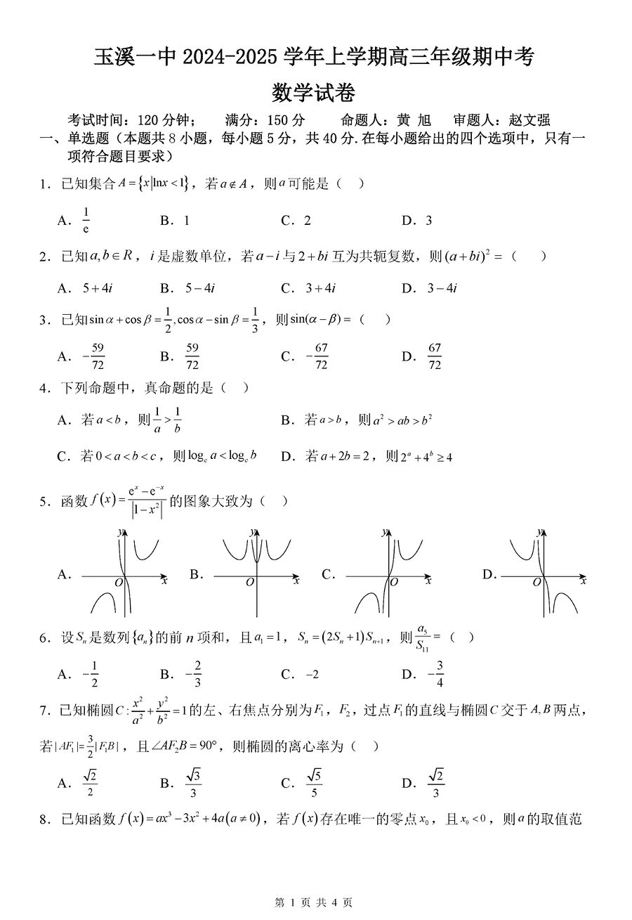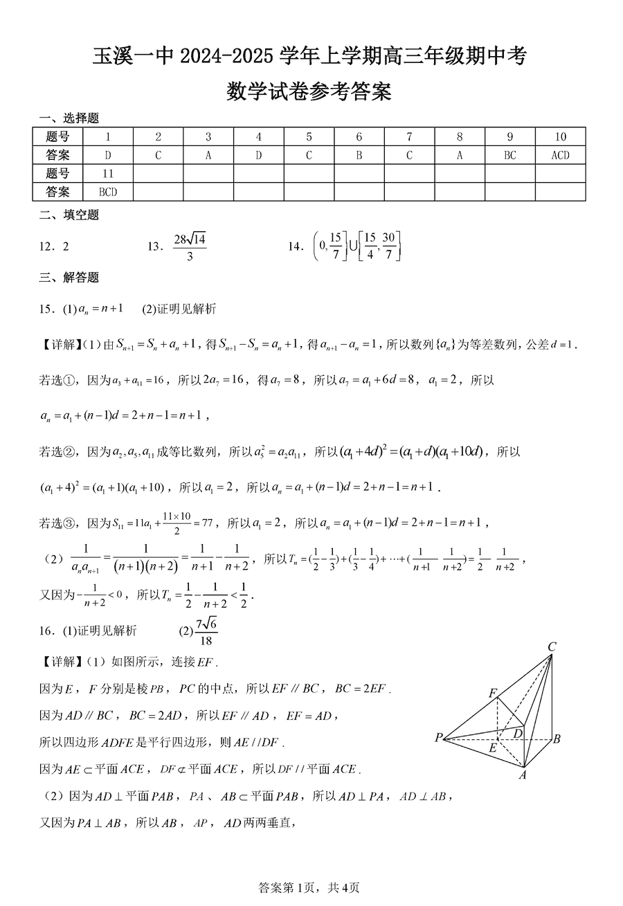 玉溪一中2024-2025学年高三上学期期中数学试题及答案