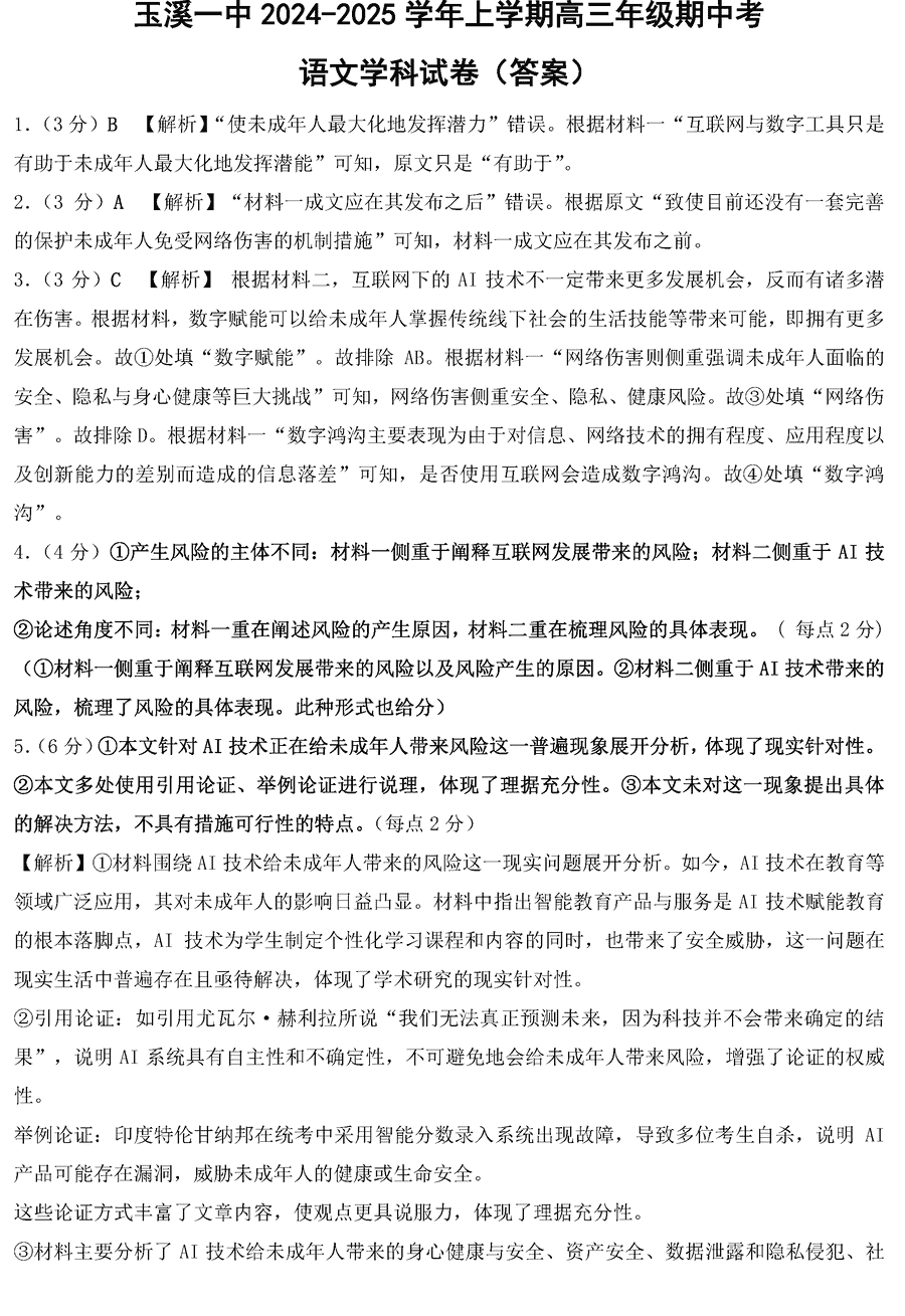 玉溪一中2024-2025学年高三上学期期中语文试题及答案