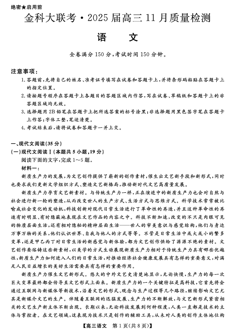 河南金科新未来大联考2025届高三上11月质检语文试题及答案