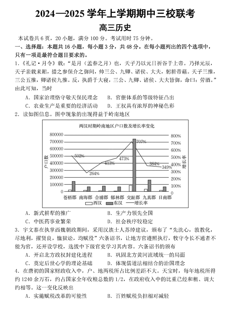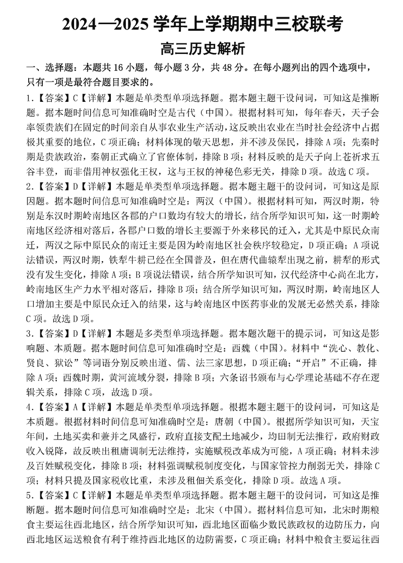 广州三校2024-2025学年高三上学期期中联考历史试题及答案