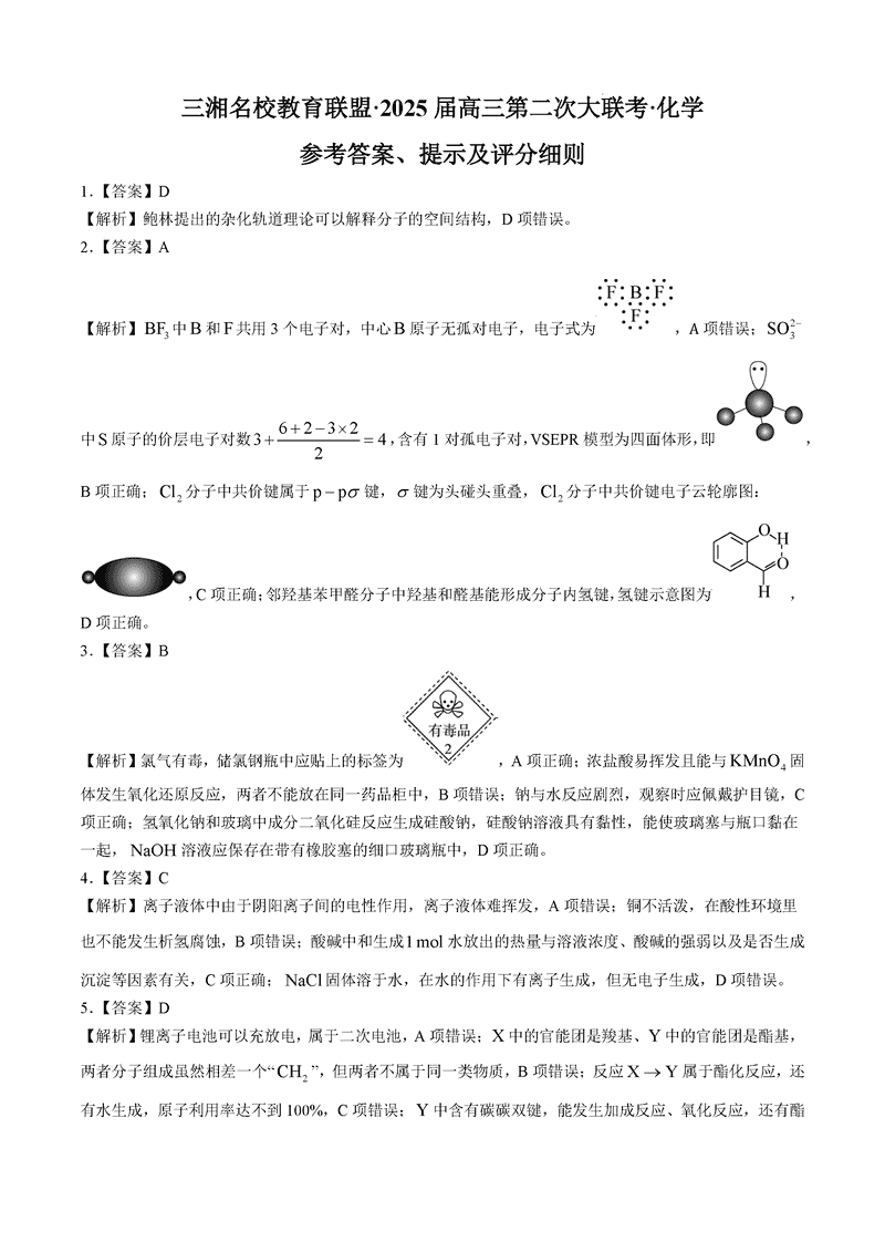 湖南三湘名校教育联盟2025届高三上第二次大联考化学考试已于近日开考,为方便考生考后及时查看考试情况,查漏补缺、弥补不足,本文整理了试题答案解析相关信息!