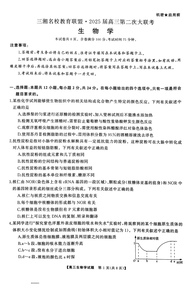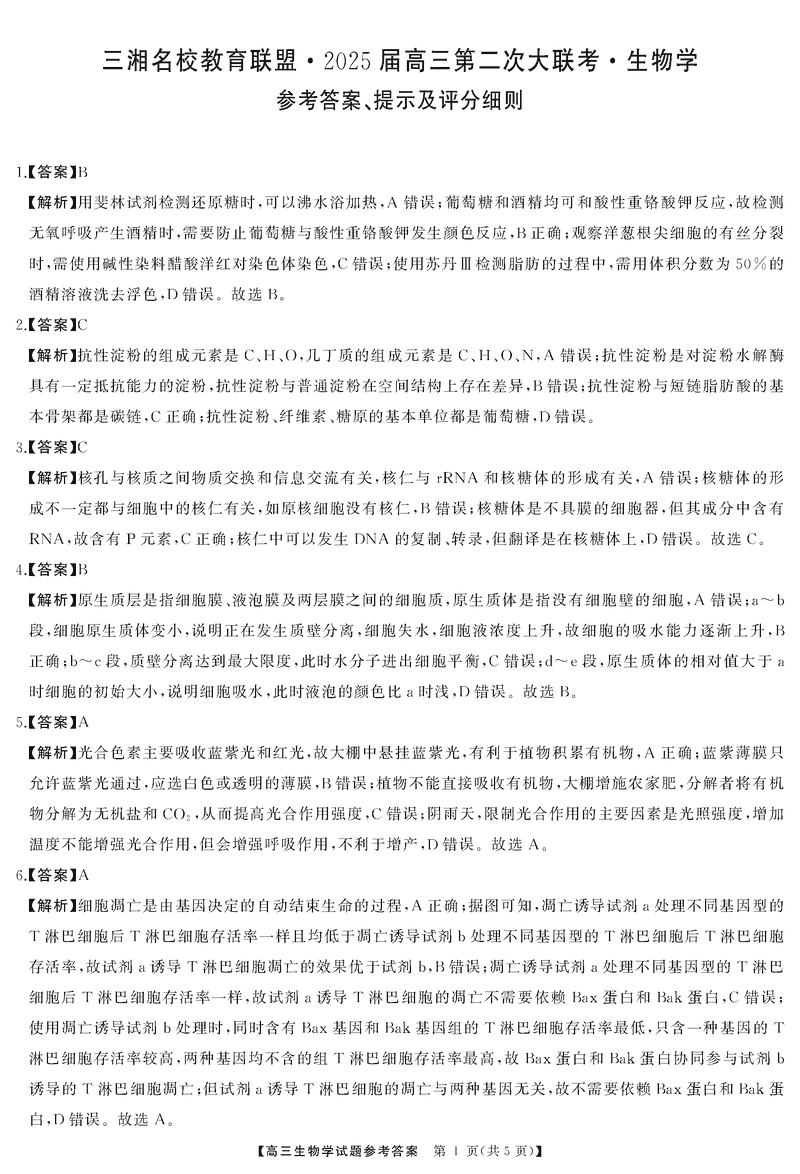 湖南三湘名校教育联盟2025届高三第二次大联考生物试题及答案