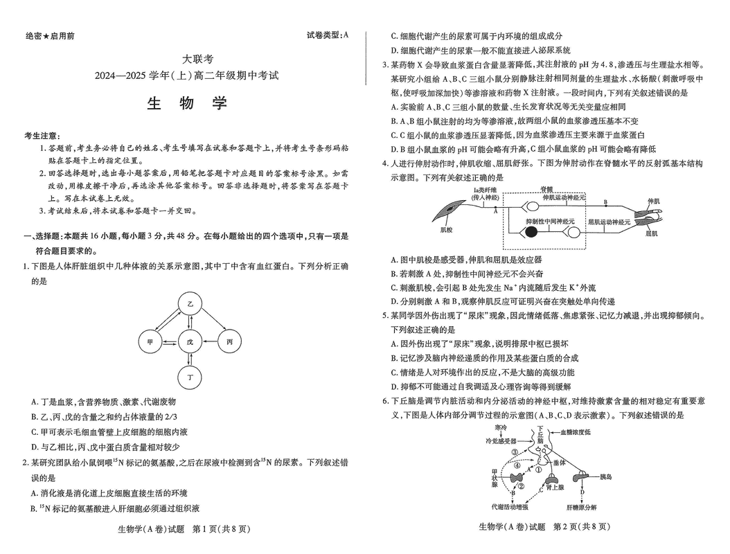 河南天一大联考2024年11月高二上学期期中生物试题及答案