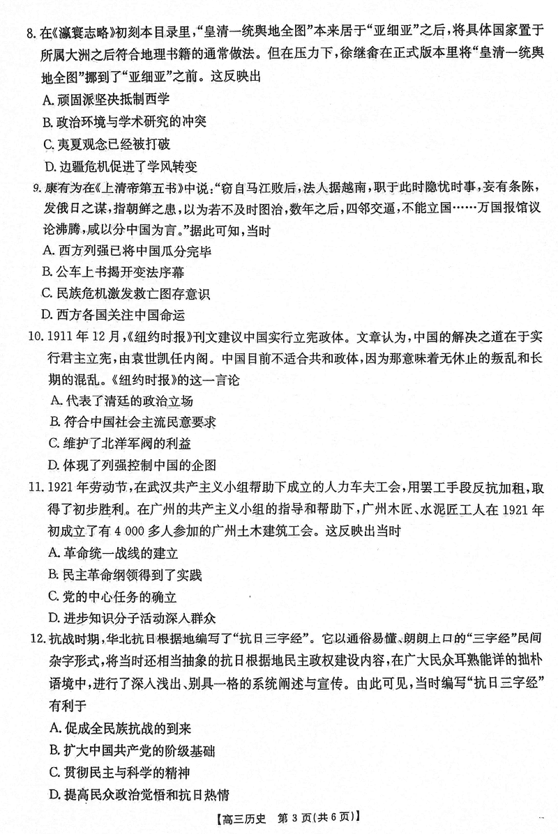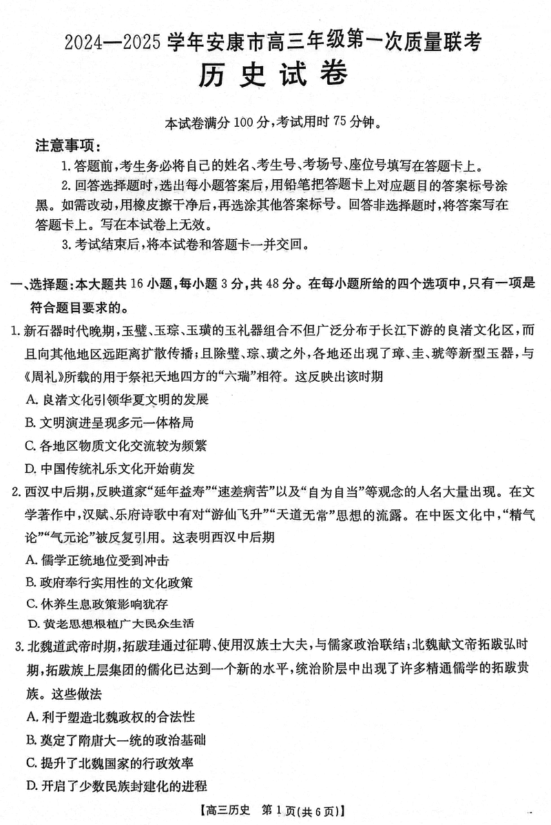 陕西安康2025届高三上学期第一次质量联考历史试题及答案