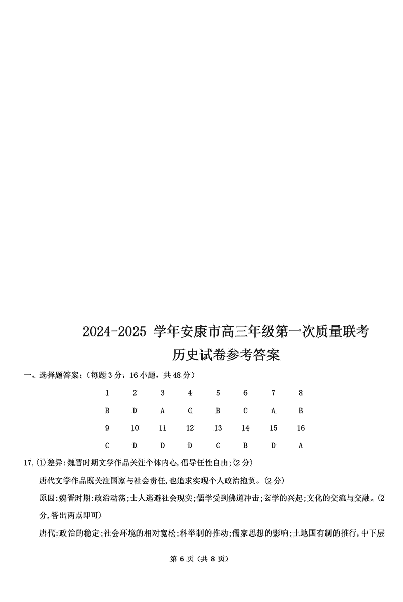 陕西安康2025届高三上学期第一次质量联考历史考试已于近日开考,为方便考生考后及时查看考试情况,查漏补缺、弥补不足,本文整理了试题答案解析相关信息!