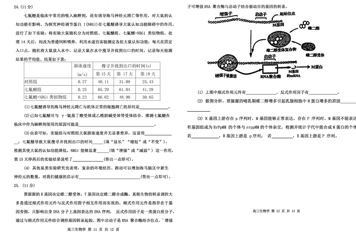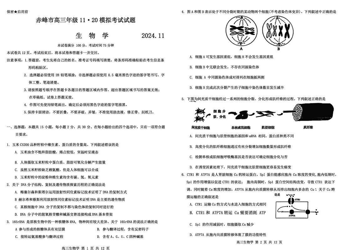 内蒙古赤峰市2024年11.20高三模拟生物试题及答案