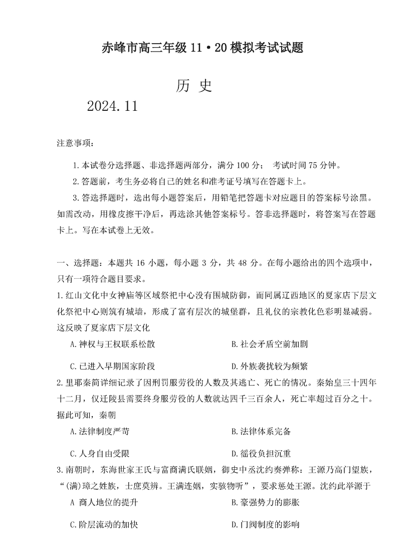 内蒙古赤峰市2024年11.20高三模拟历史试题及答案
