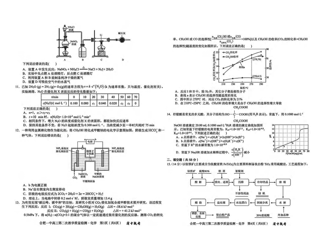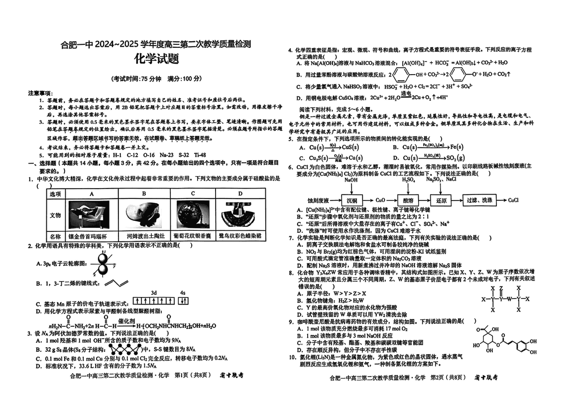安徽省十联考合肥一中2025届高三第二次质检化学试题及答案