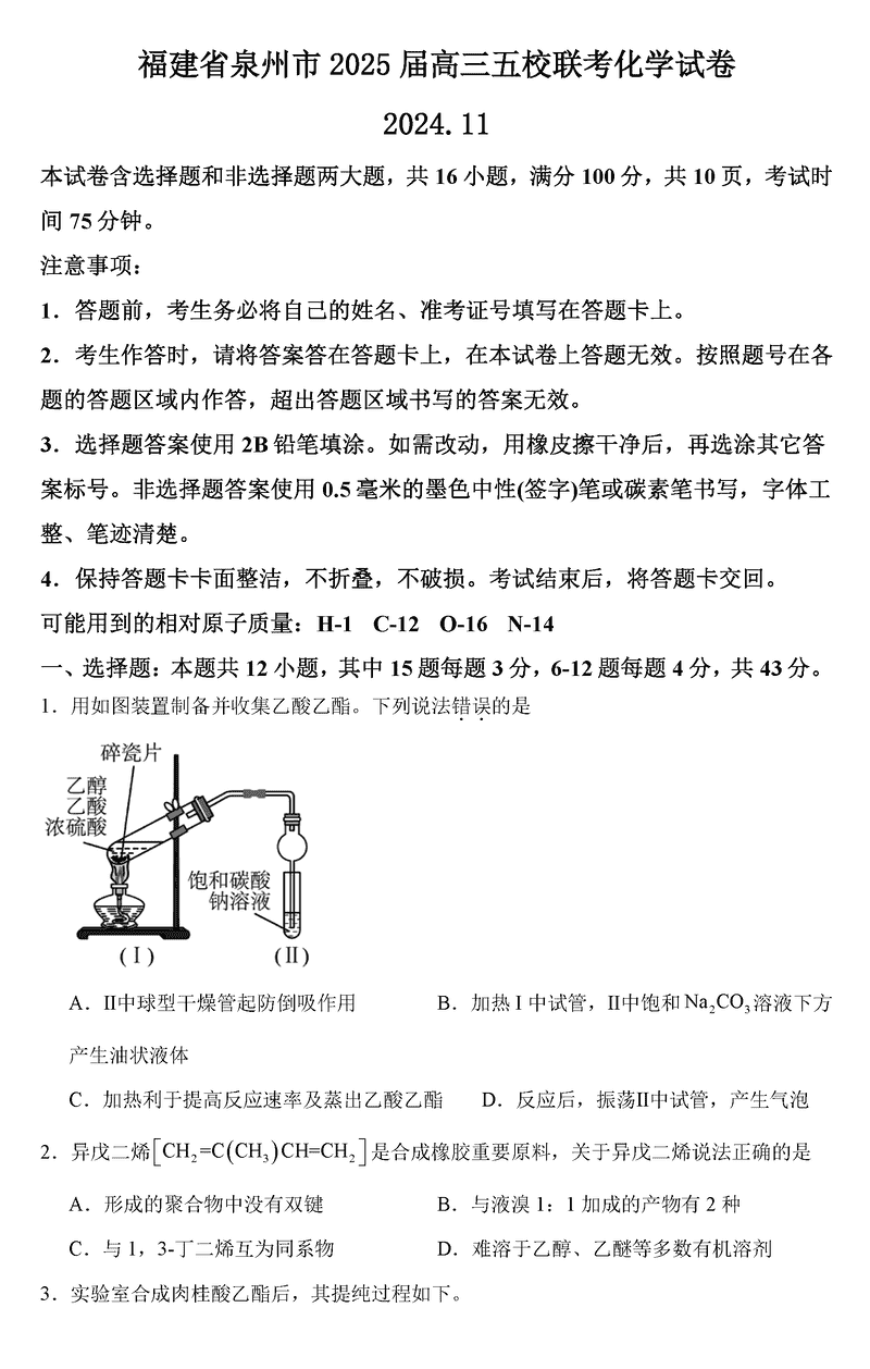泉州五校2025届高三上学期11月期中联考化学考试已于近日开考,为方便考生考后及时查看考试情况,查漏补缺、弥补不足,本文整理了试题答案解析相关信息!