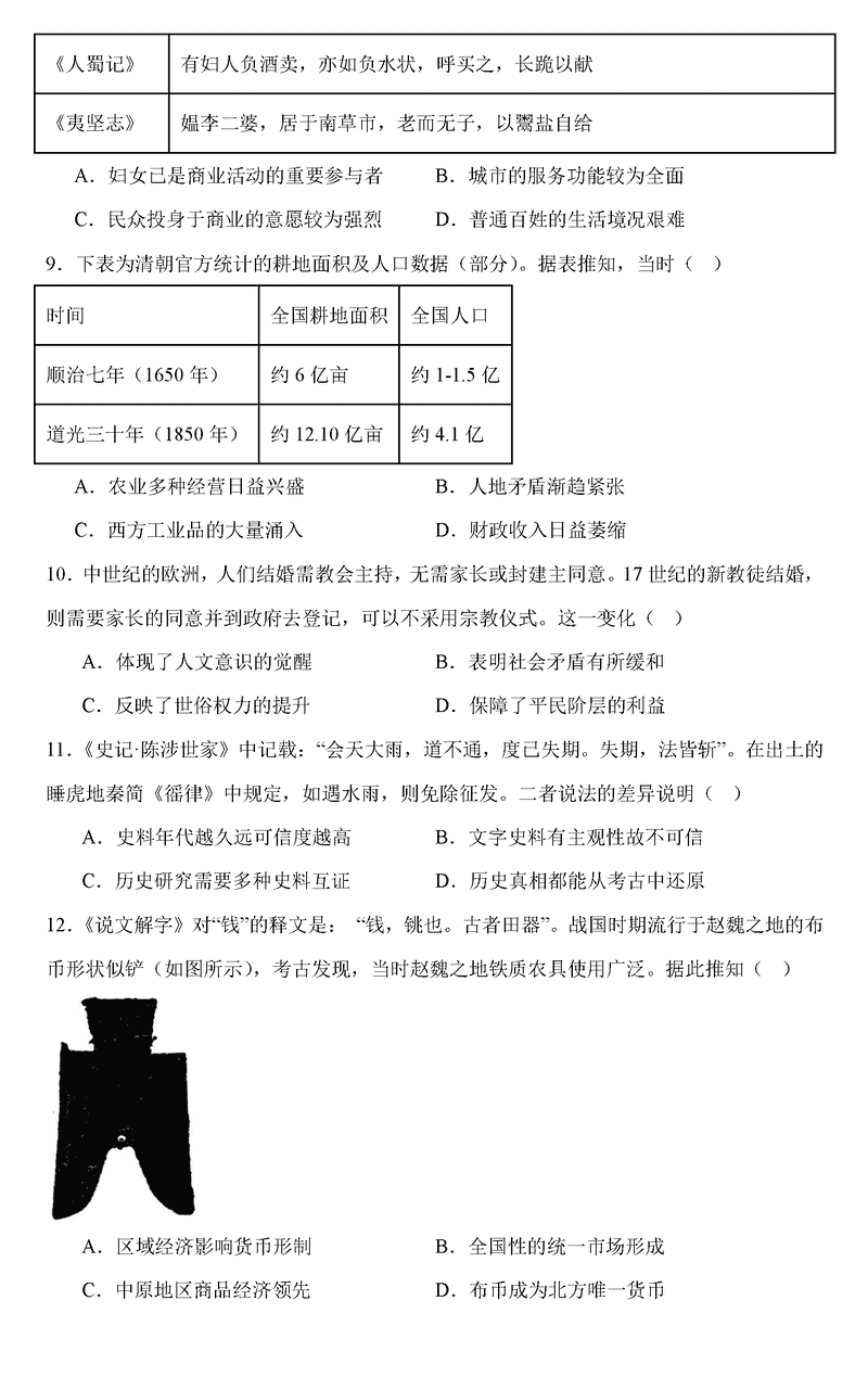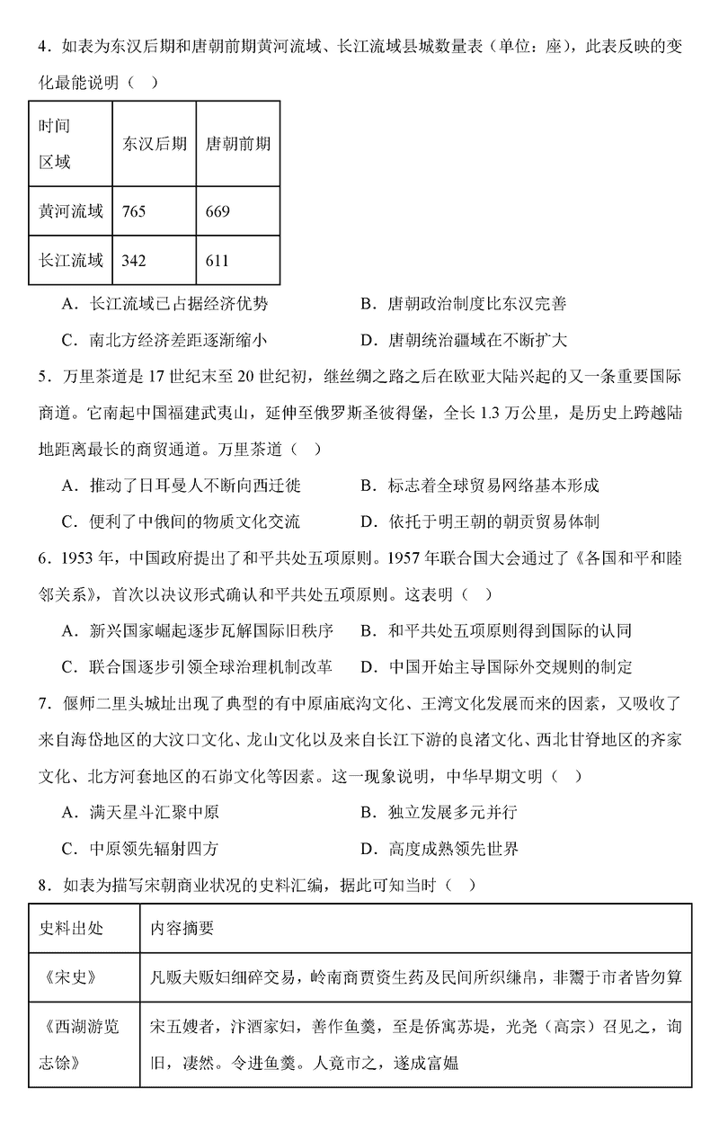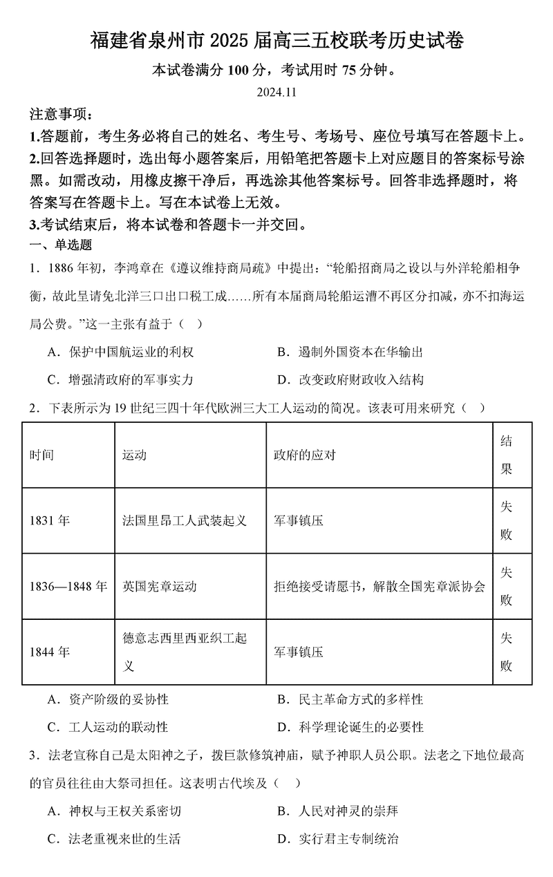 泉州五校2025届高三上学期11月期中联考历史试题及答案