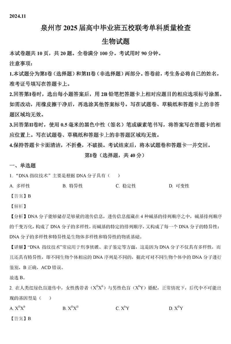泉州五校2025届高三上学期11月期中联考生物考试已于近日开考,为方便考生考后及时查看考试情况,查漏补缺、弥补不足,本文整理了试题答案解析相关信息!