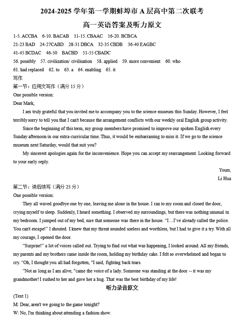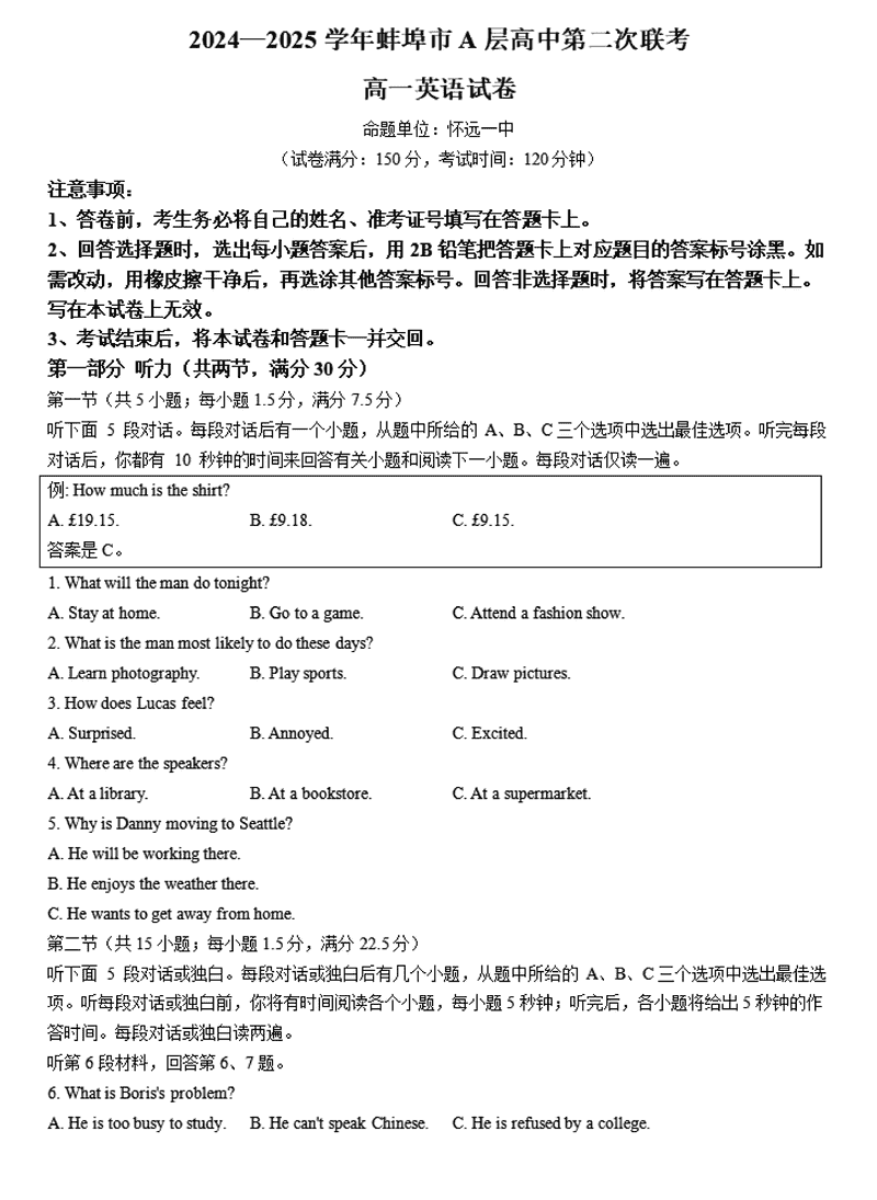 蚌埠市A层高中2024年11月高一第二次联考英语试题及答案