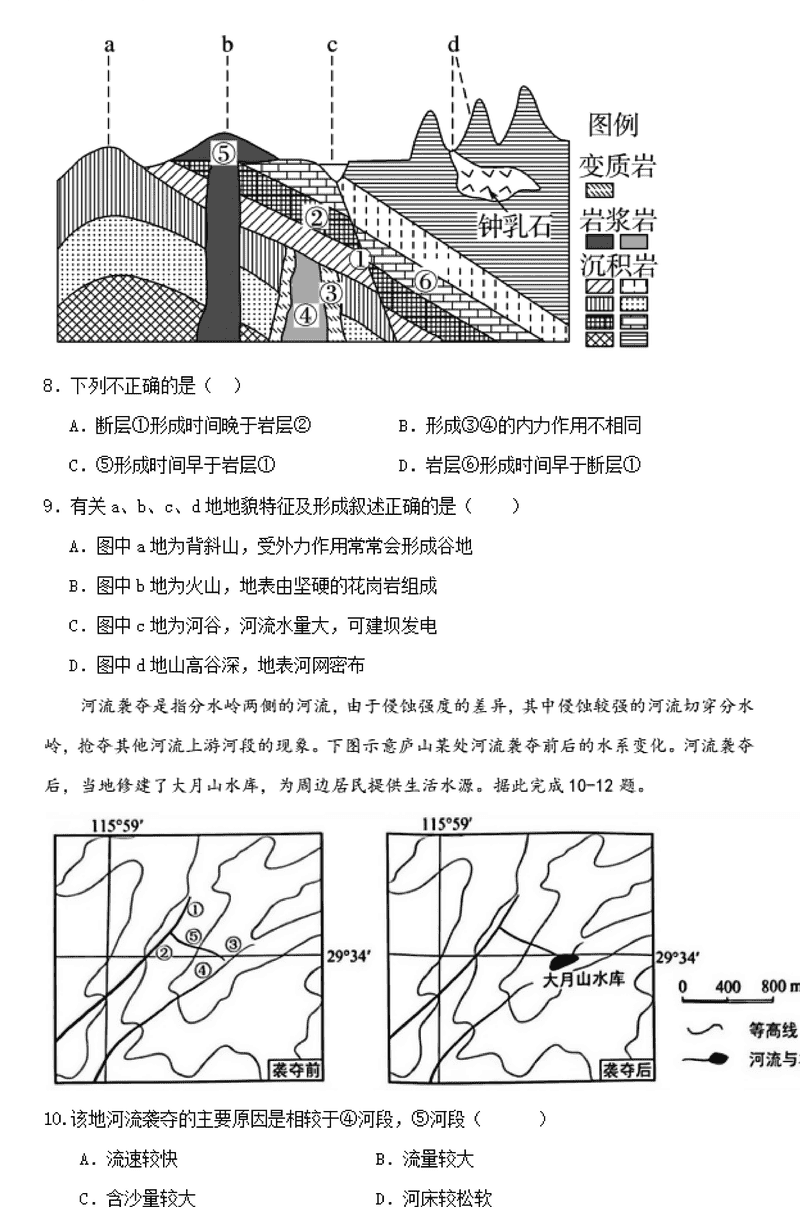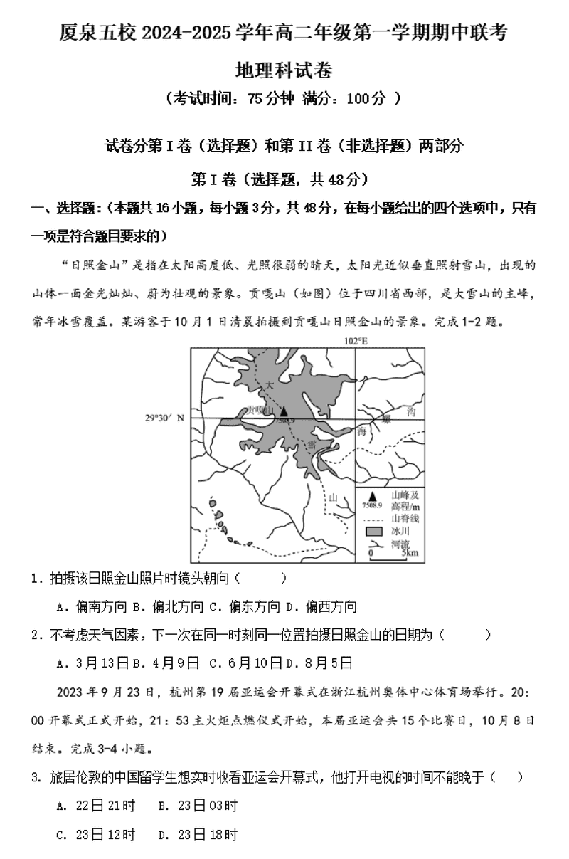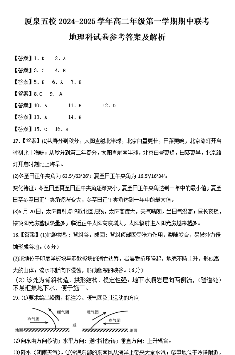 厦泉五校2024年11月高二上学期期中联考地理试题及答案