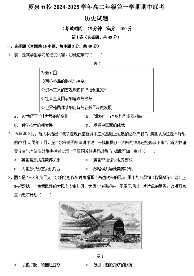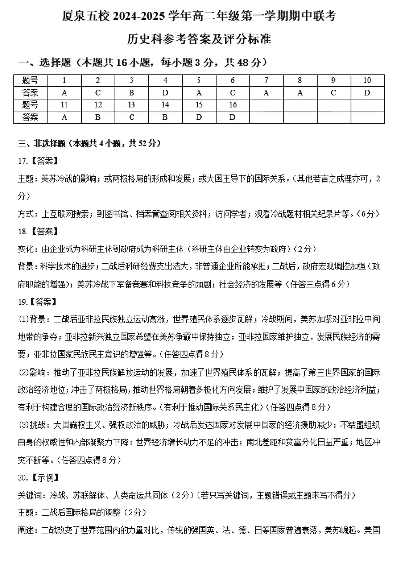 厦泉五校2024年11月高二上学期期中联考历史试题及答案