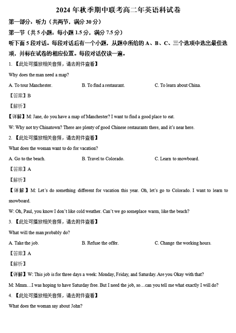 厦门市、泉州市五校2024-2025学年高二上学期11月期中联考英语考试已于近日开考,为方便考生考后及时查看考试情况,查漏补缺、弥补不足,本文整理了试题答案解析相关信息!