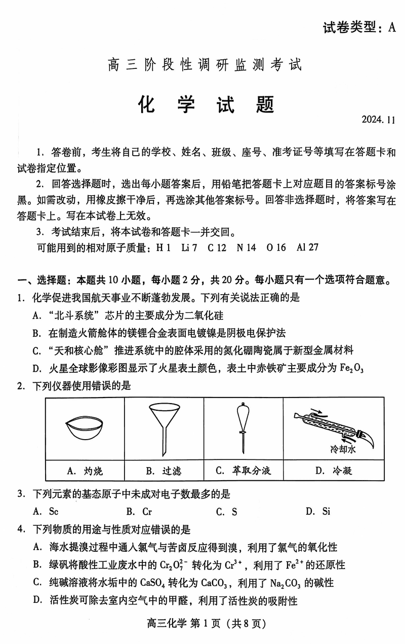 山东潍坊2024-2025学年高三上学期11月期中化学试题及答案