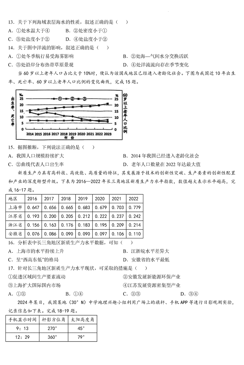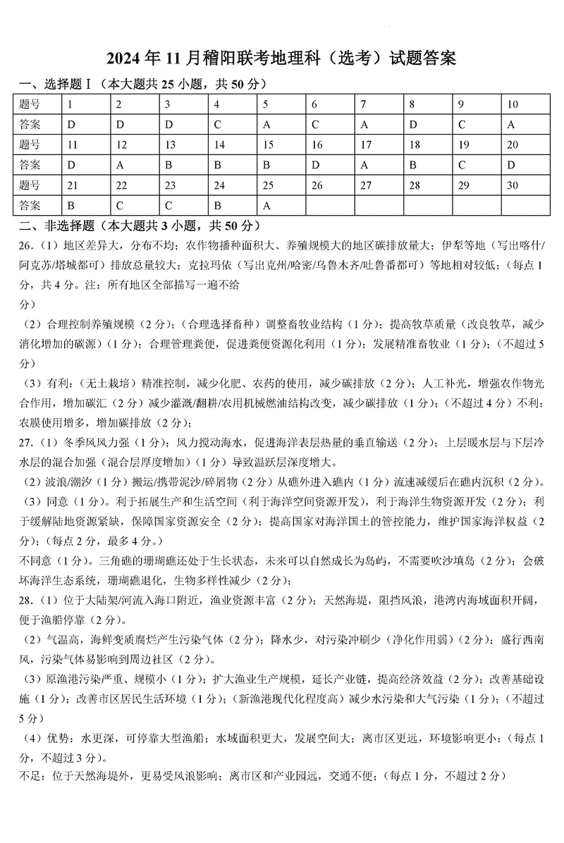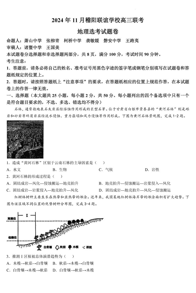 浙江稽阳联谊学校2024年11月高三上学期联考地理试题及答案