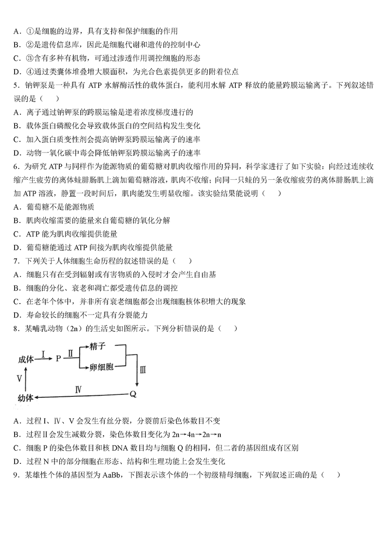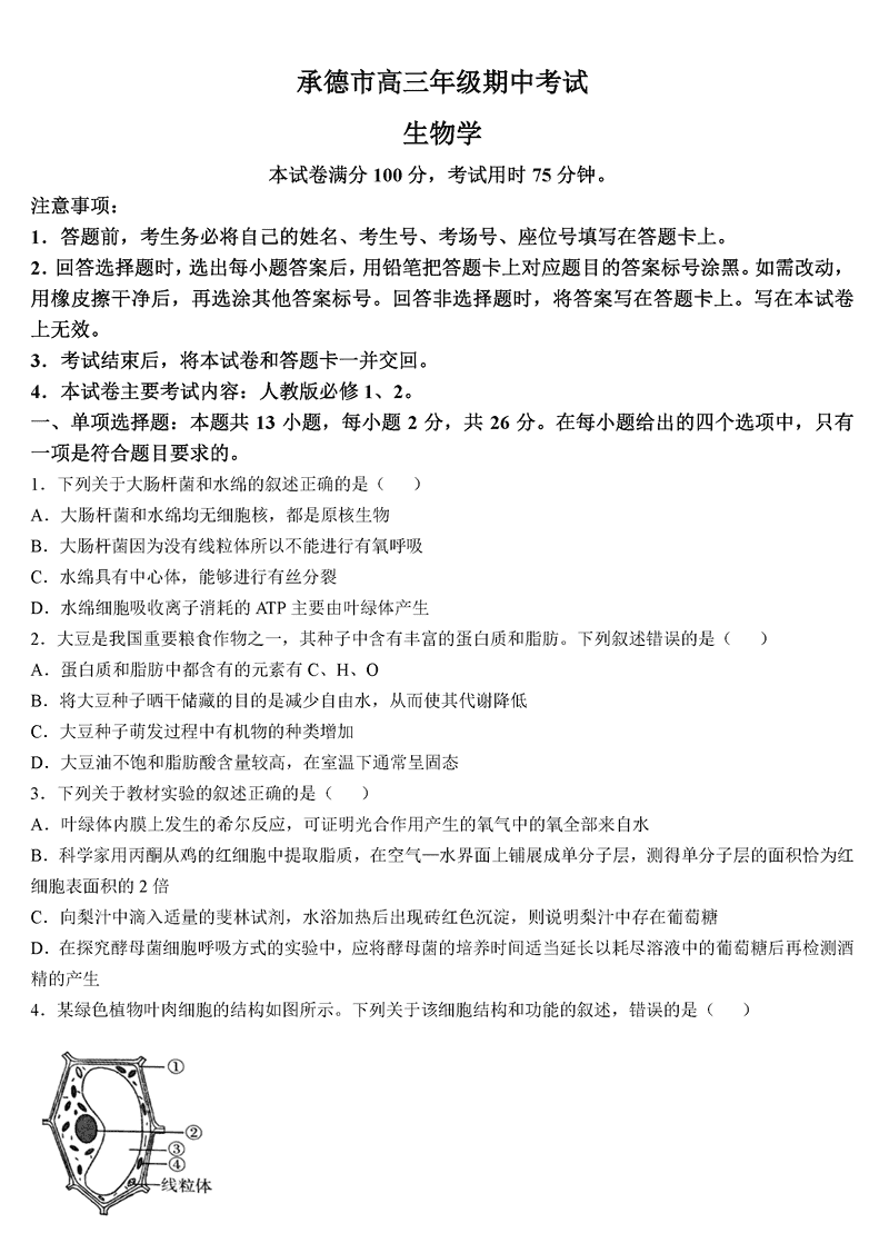 河北承德2024-2025学年高三上学期期中生物试题及答案