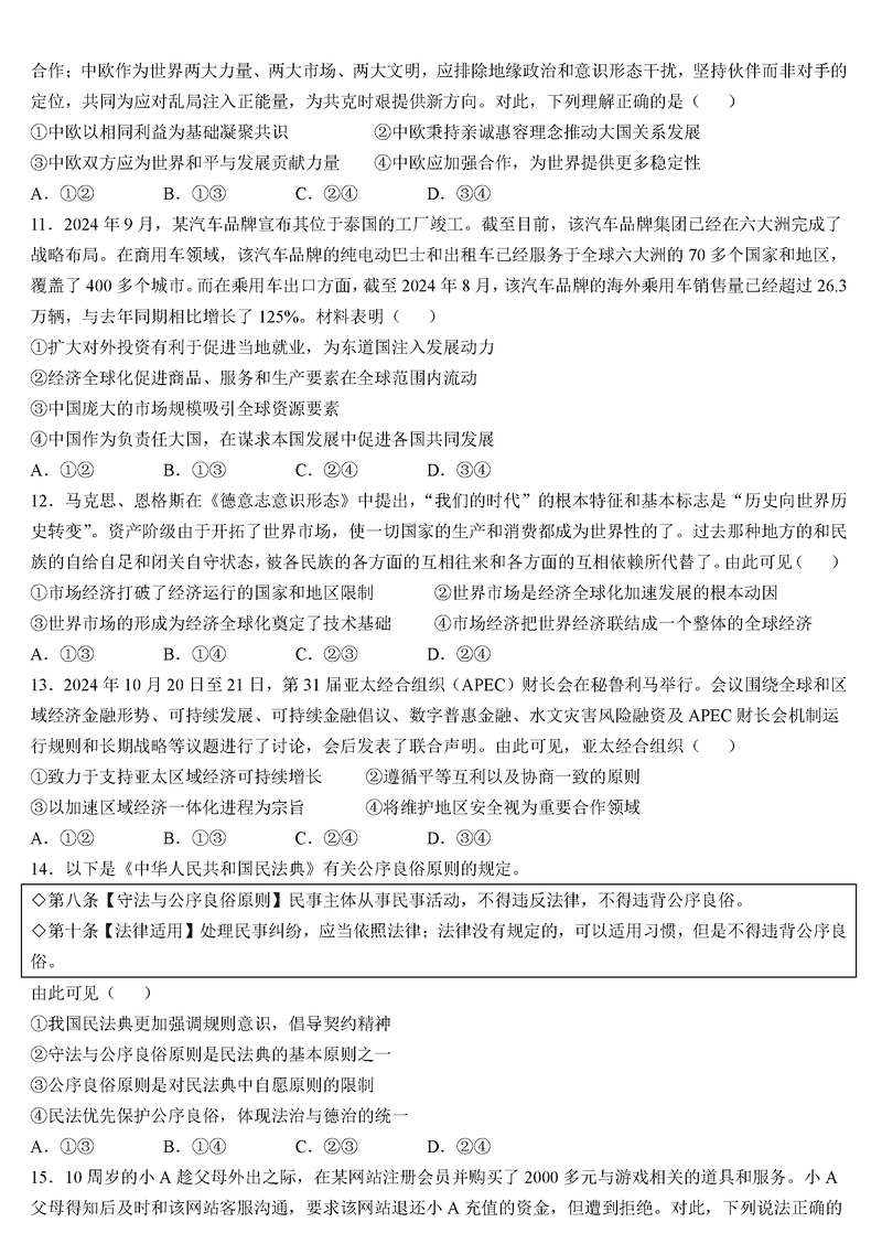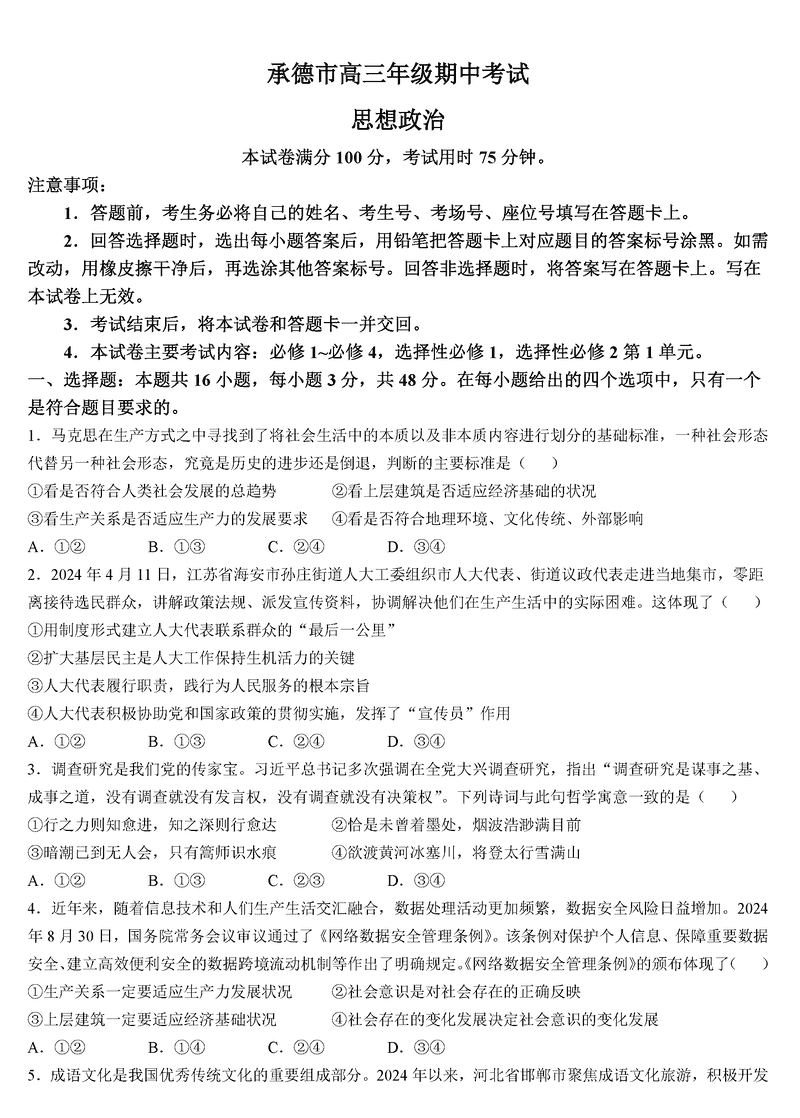 河北承德2024-2025学年高三上学期期中政治试题及答案