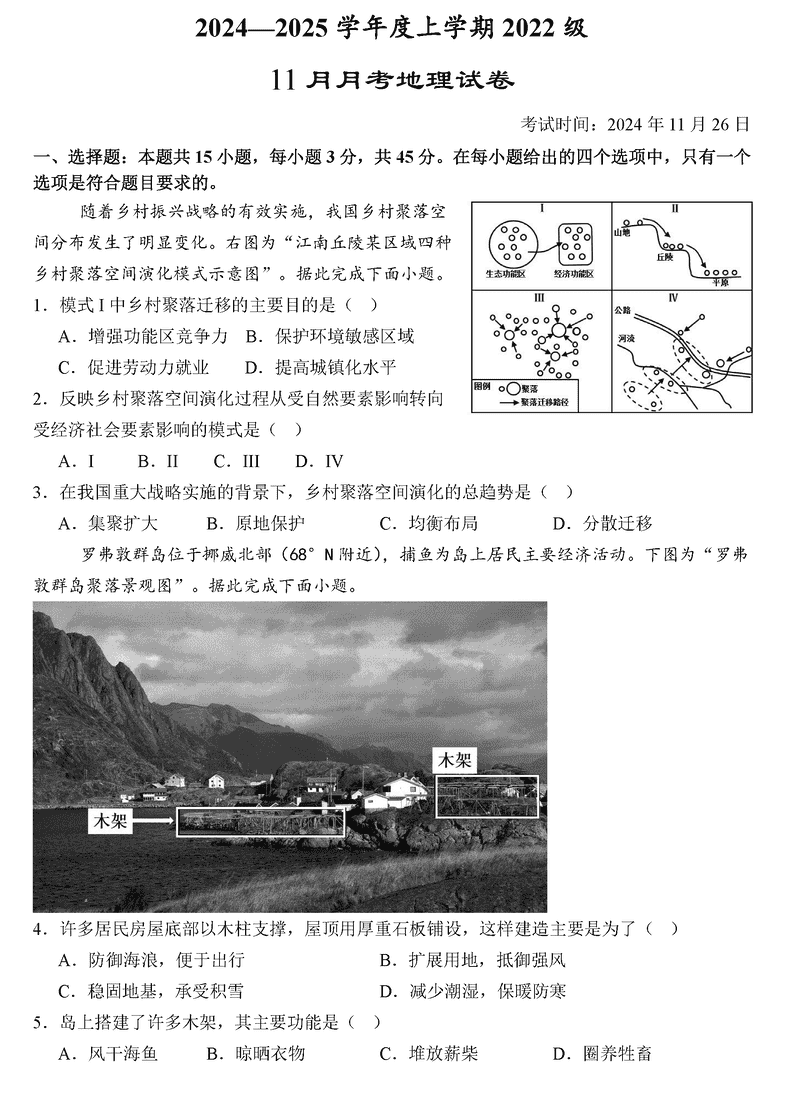 2025届湖北沙市中学高三11月月考地理试题及答案