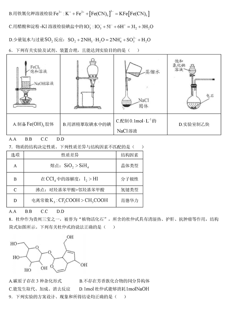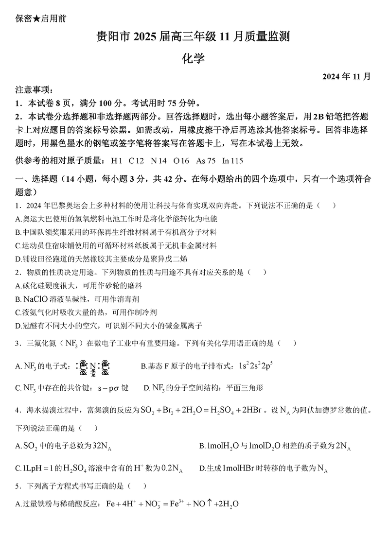 贵阳市2025届高三上学期11月质量监测化学试题及答案