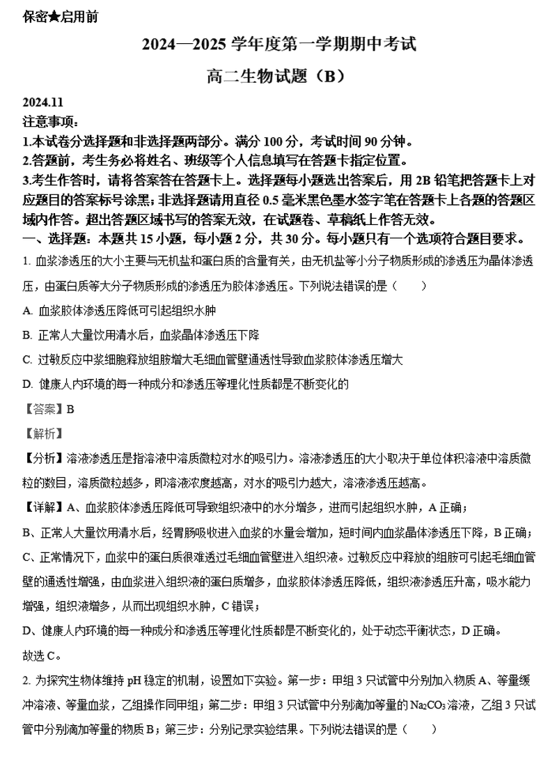 山东菏泽2024-2025学年高二上学期期中生物考试已于近日开考,为方便考生考后及时查看考试情况,查漏补缺、弥补不足,本文整理了试题答案解析相关信息!