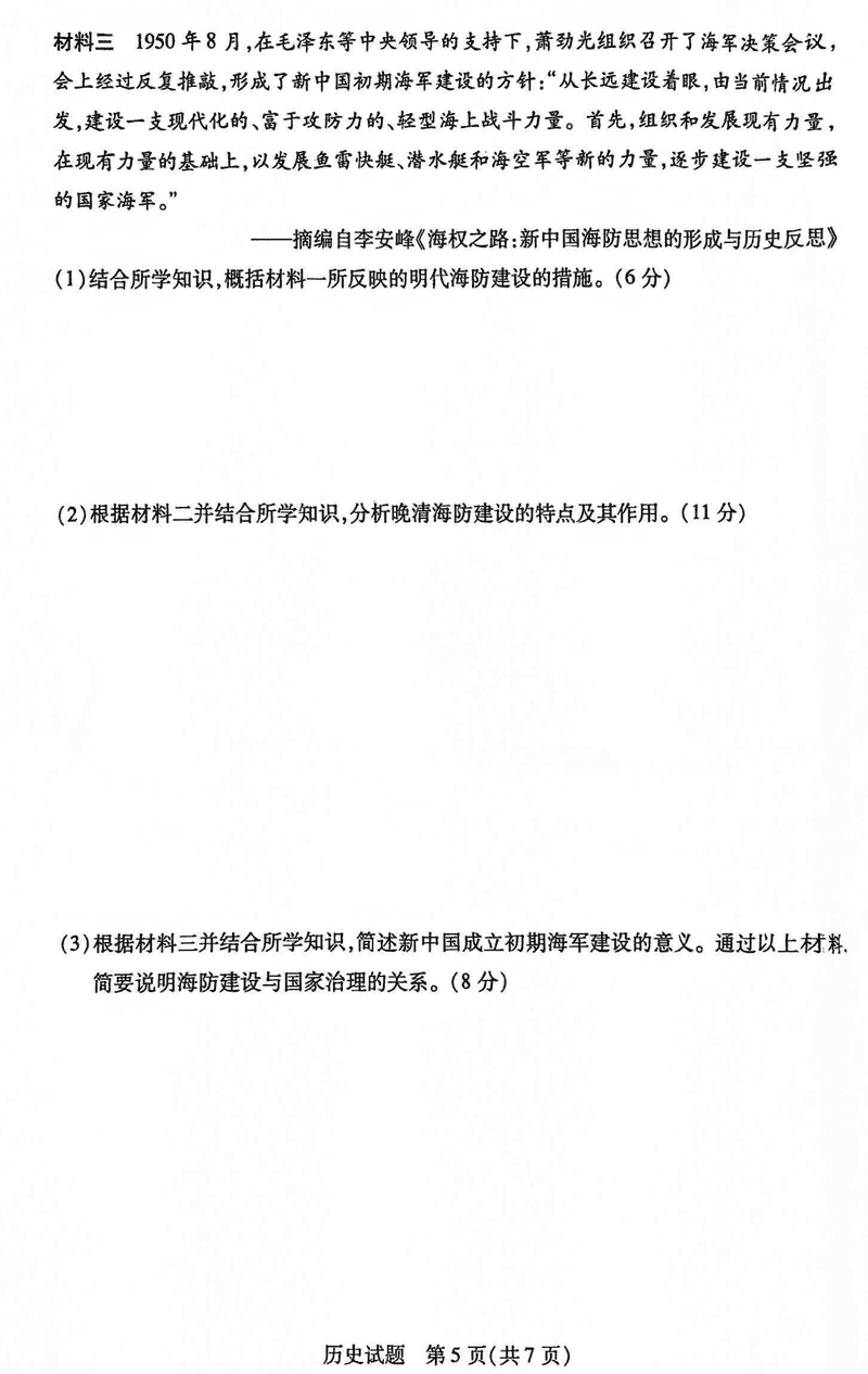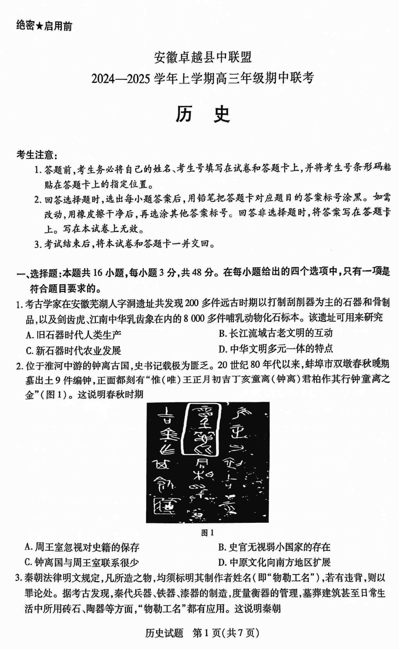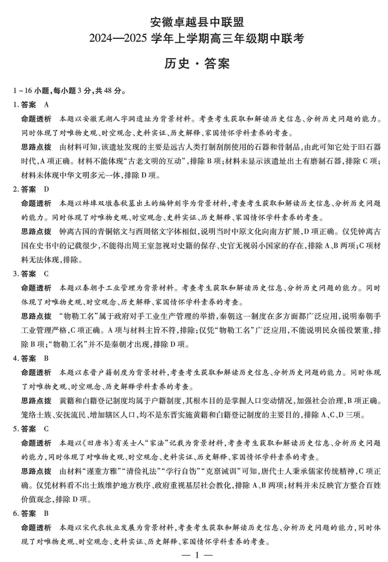 安徽卓越县中联盟2025届高三11月期中历史试题及答案