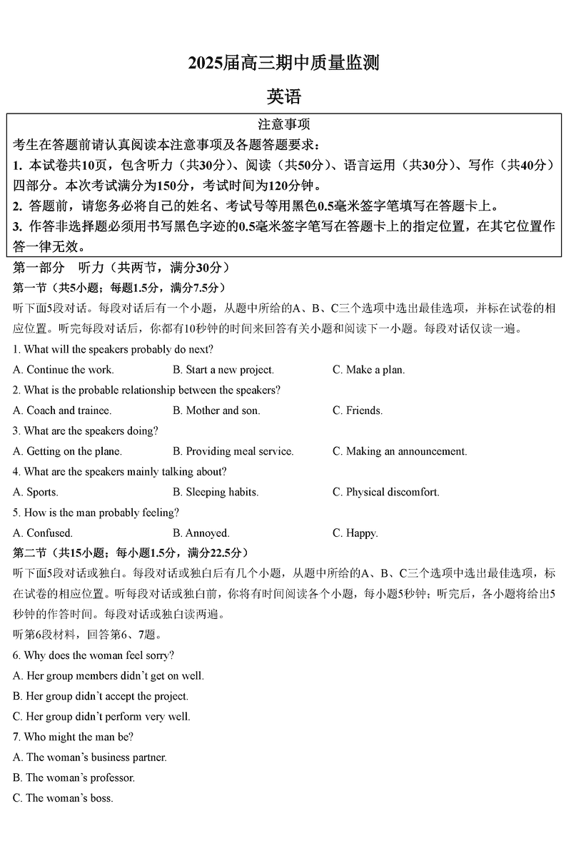 南通通州区、如东县2025届高三上学期期中联考英语考试已于近日开考,为方便考生考后及时查看考试情况,查漏补缺、弥补不足,本文整理了试题答案解析相关信息!