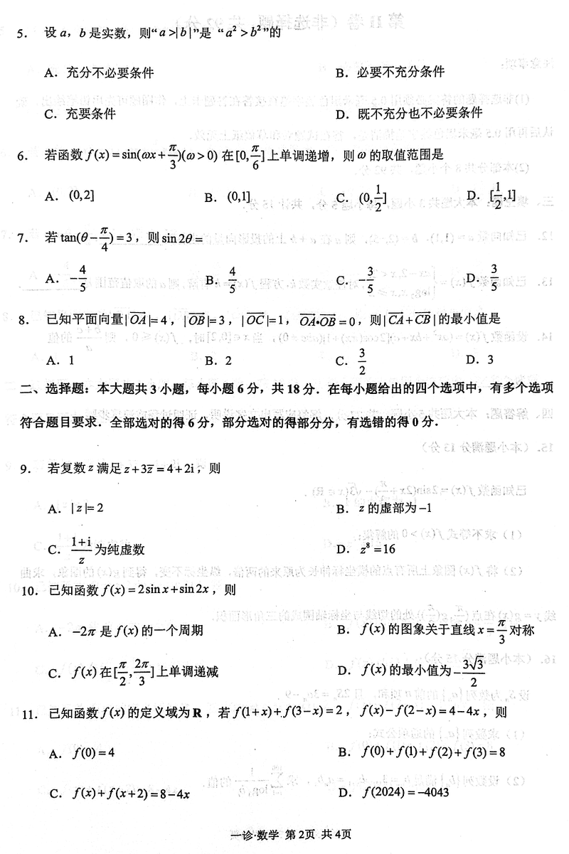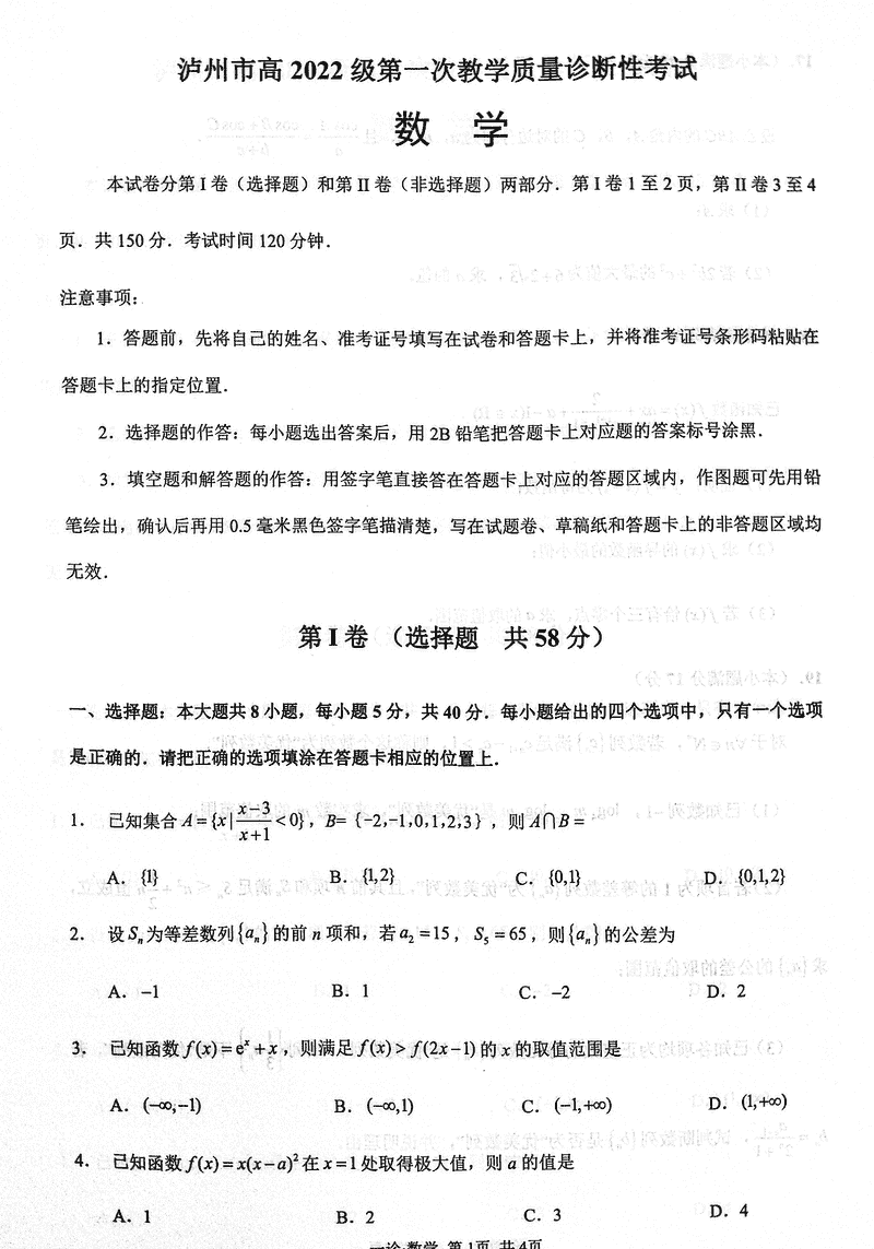 泸州一诊高2025届第一次教学质量诊断数学试题及答案