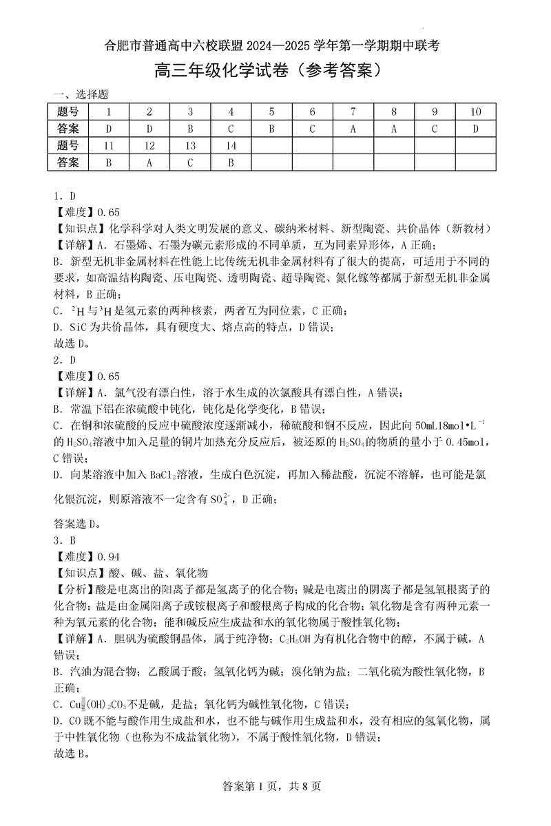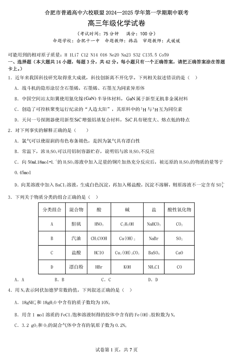 合肥六校联盟2025届高三上学期期中联考化学试题及答案