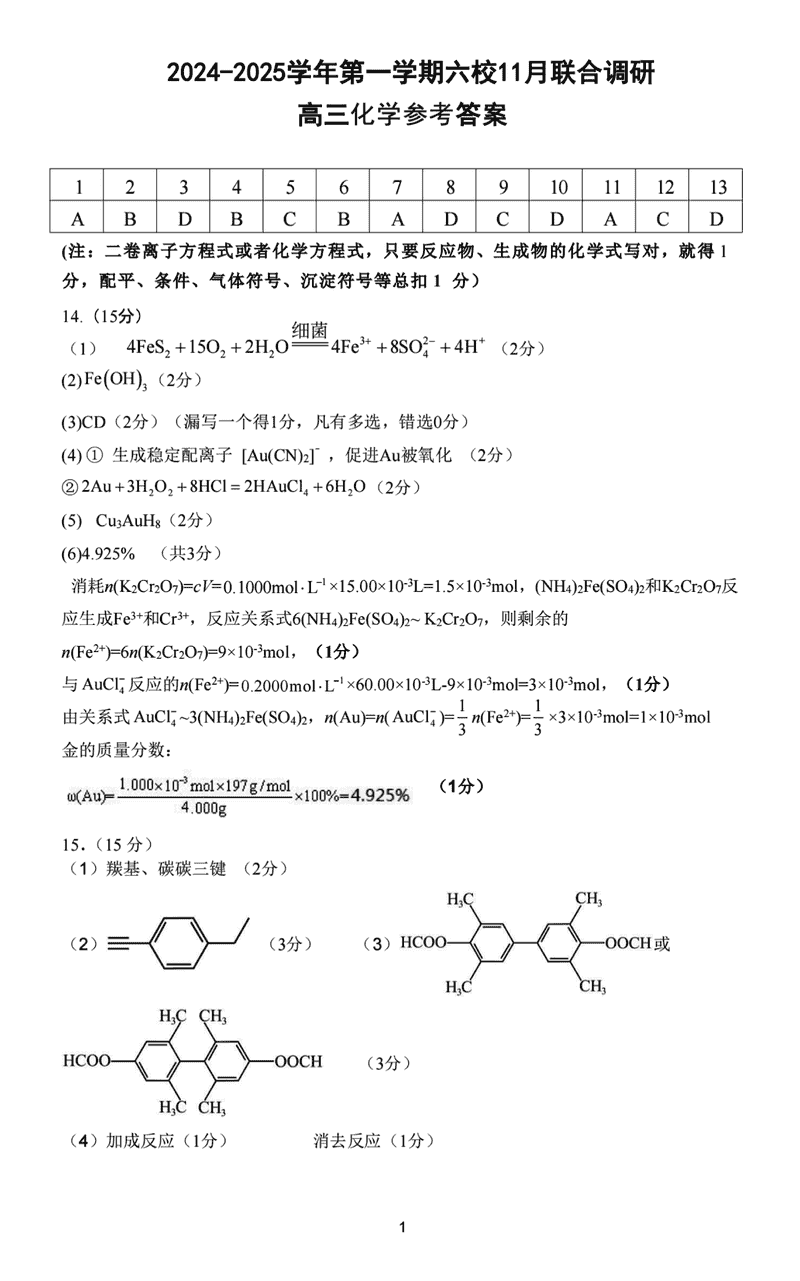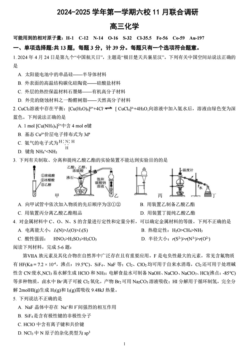 南京六校联合体2025届高三上学期11月联考化学考试已于近日开考,为方便考生考后及时查看考试情况,查漏补缺、弥补不足,本文整理了试题答案解析相关信息!