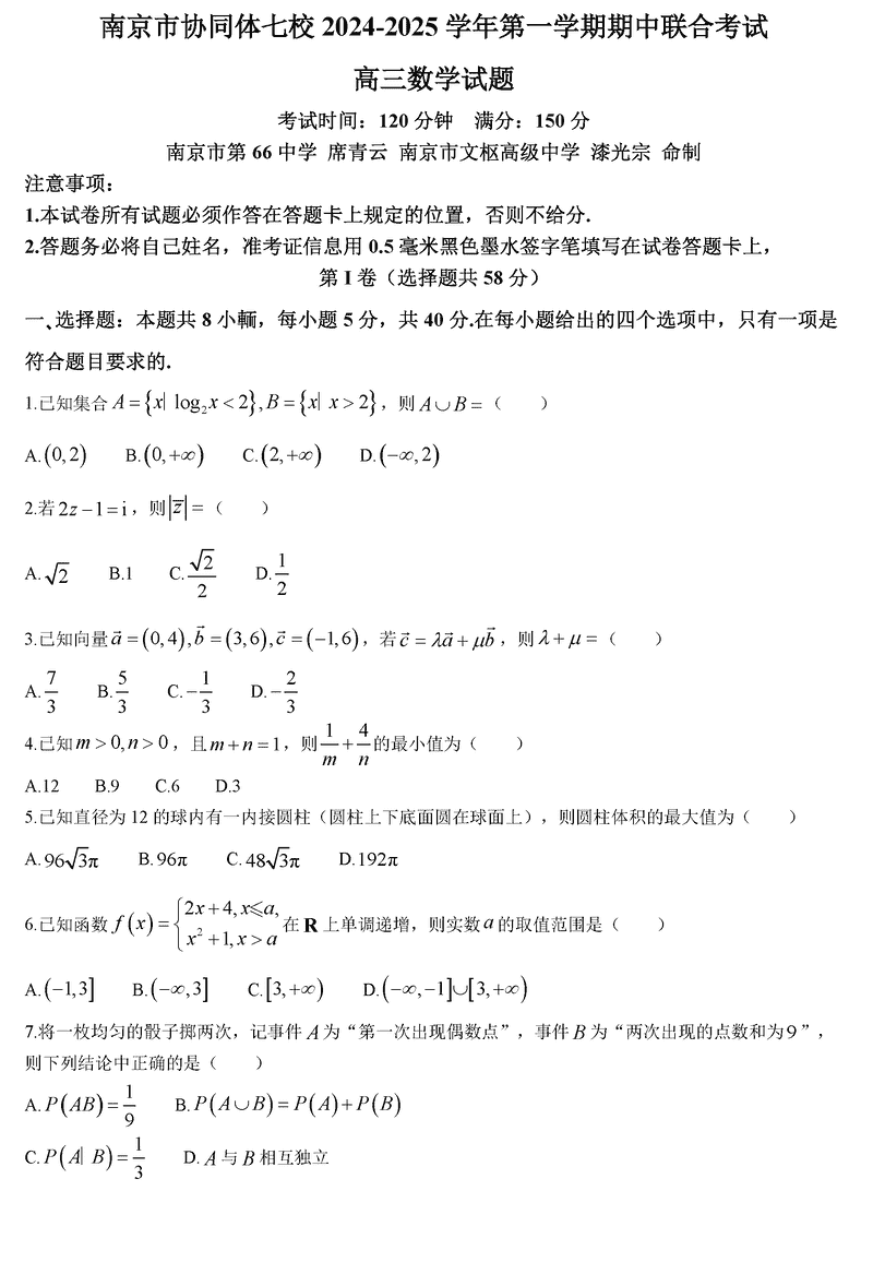 南京协同体七校2025届高三期中联考数学试题及答案 时间:2024-12-02 17:31 江苏 数学试题 南京协同体七校2025届高三期中联考数学考试已于近日开考,为方便考生考后及时查看考试情况,查漏补缺、弥补不足,本文整理了试题答案解析相关信息! 汇总:南京协同体七校2025届高三期中联考试题及答案汇总 数学试题及答案解析