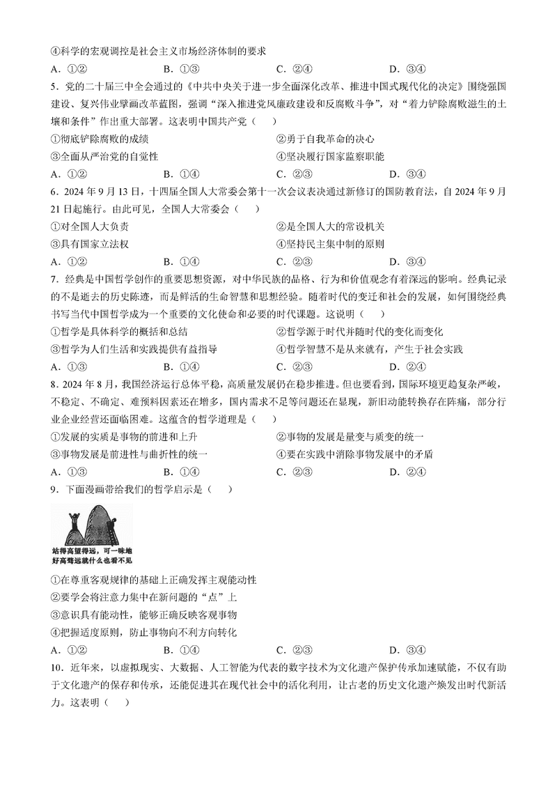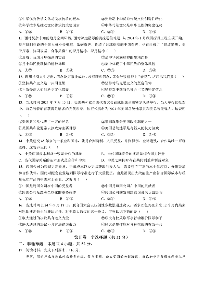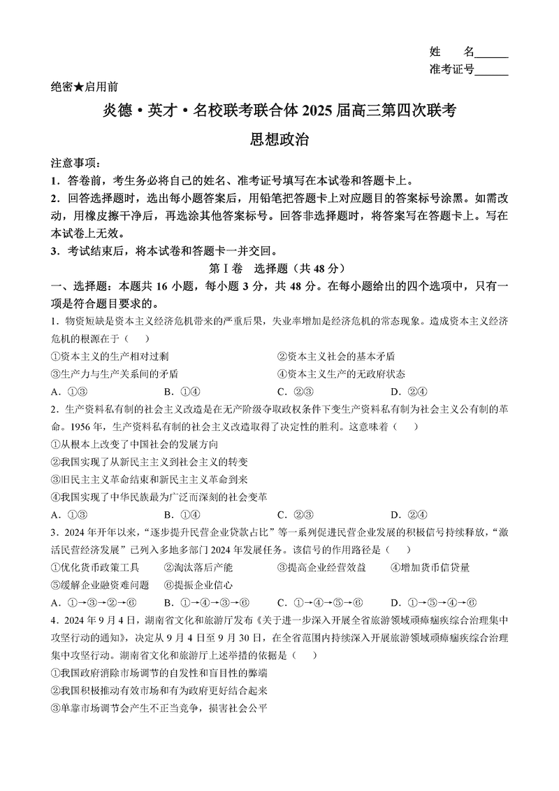 湖南名校联考联合体2025届高三第四次联考政治试题及答案
