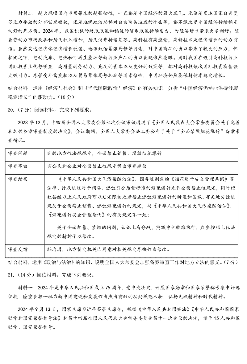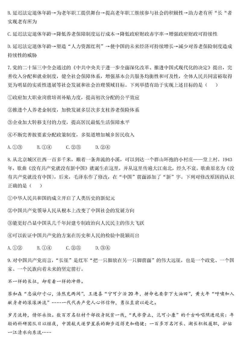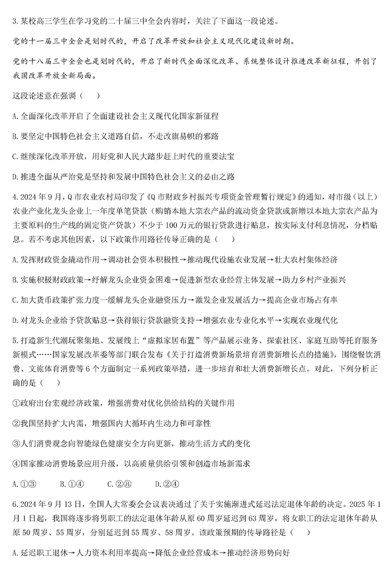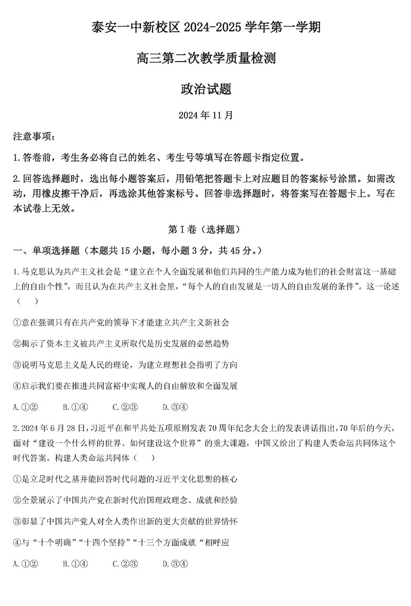 山东泰安一中2025届高三上第二次质检政治试题及答案