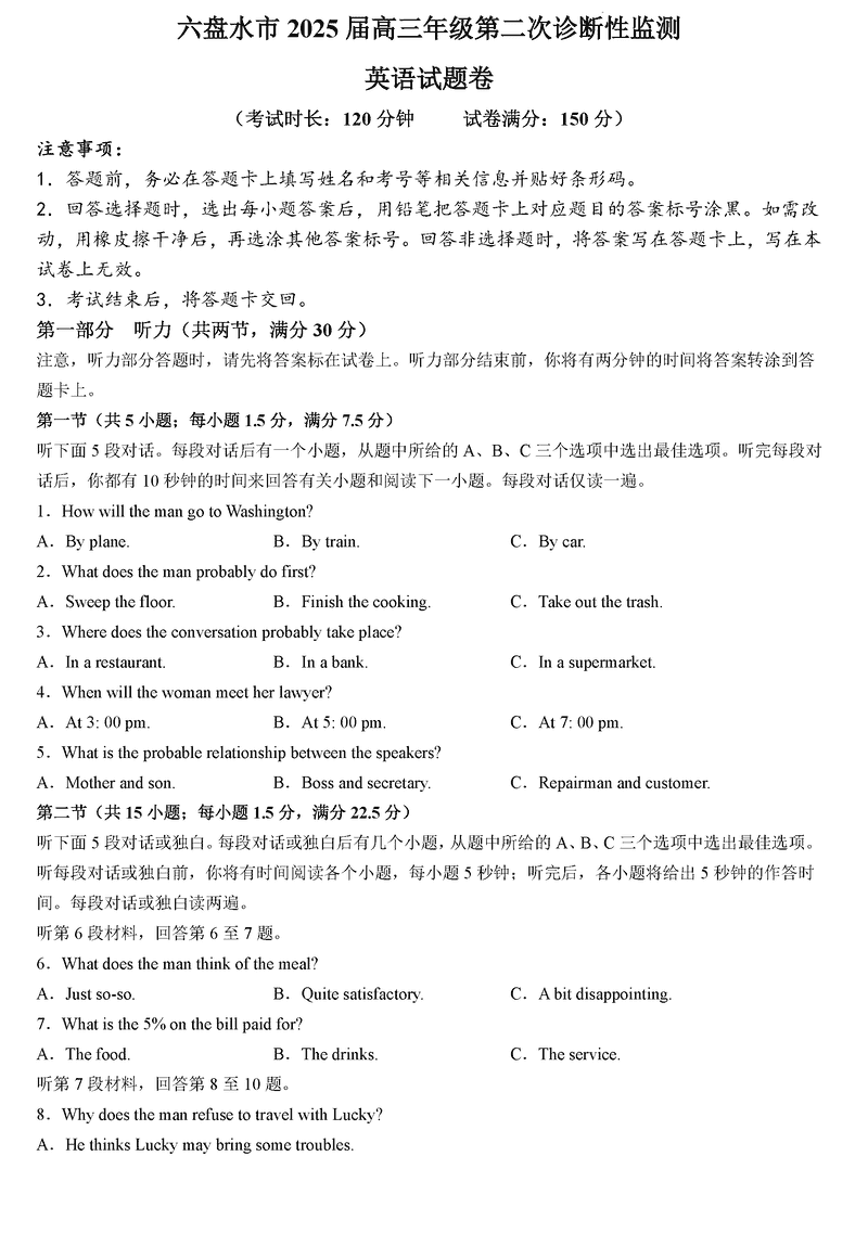 六盘水2025届高三上学期第二次诊断英语考试已于近日开考,为方便考生考后及时查看考试情况,查漏补缺、弥补不足,本文整理了试题答案解析相关信息!