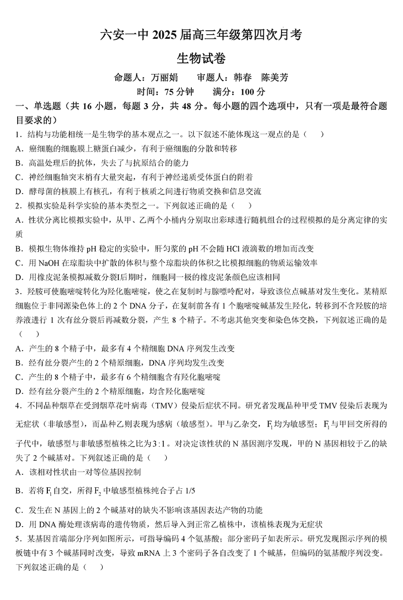 六安一中2025届高三第四次月考生物考试已于近日开考,为方便考生考后及时查看考试情况,查漏补缺、弥补不足,本文整理了试题答案解析相关信息!