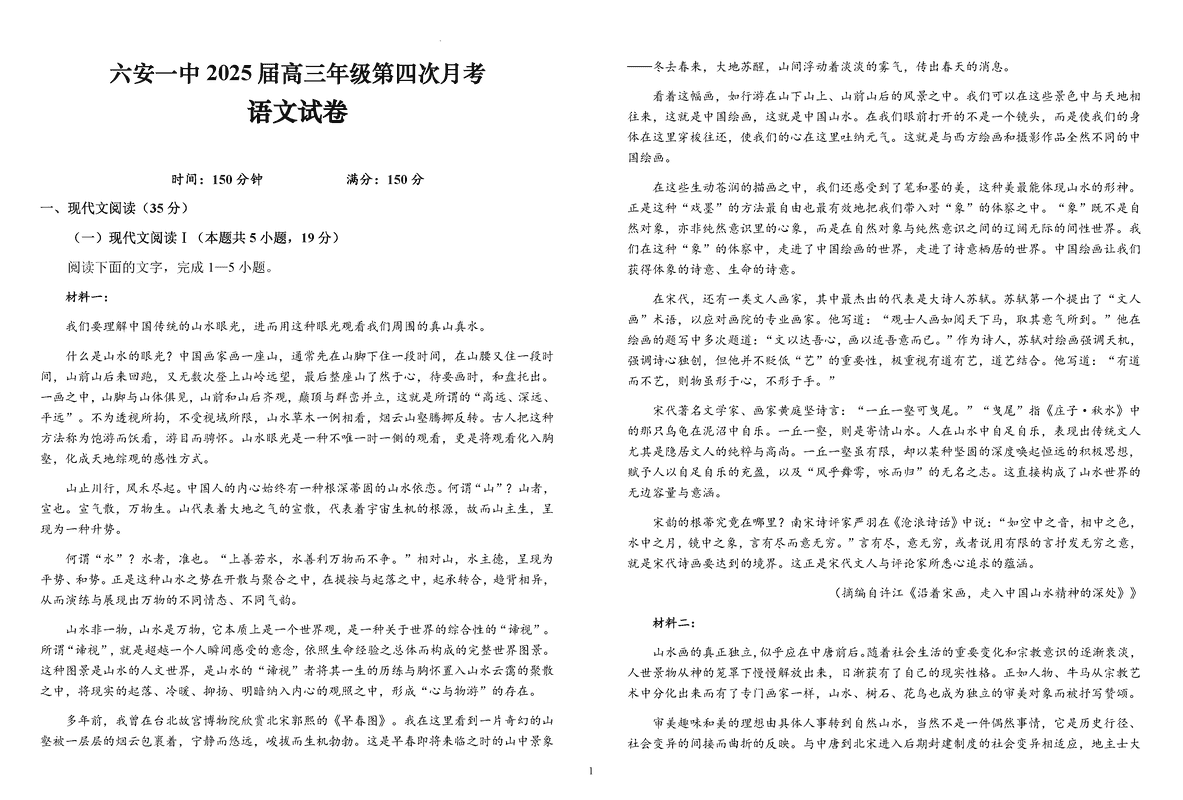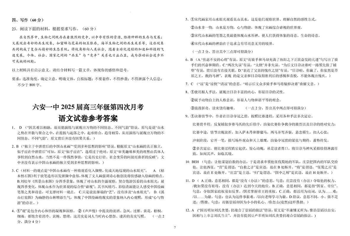 六安一中2025届高三第四次月考语文考试已于近日开考,为方便考生考后及时查看考试情况,查漏补缺、弥补不足,本文整理了试题答案解析相关信息!
