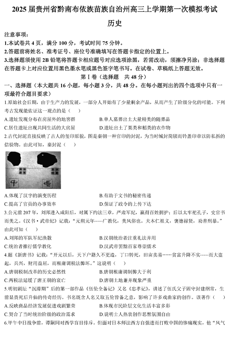 贵州黔南州025届高三第一次模考历史试题及答案 时间:2024-12-04 21:50 贵州 文综试题 贵州黔南州025届高三第一次模考历史考试已于近日开考,为方便考生考后及时查看考试情况,查漏补缺、弥补不足,本文整理了试题答案解析相关信息! 汇总:贵州黔南025届高三第一次模考试题及答案汇总 历史试题及答案解析