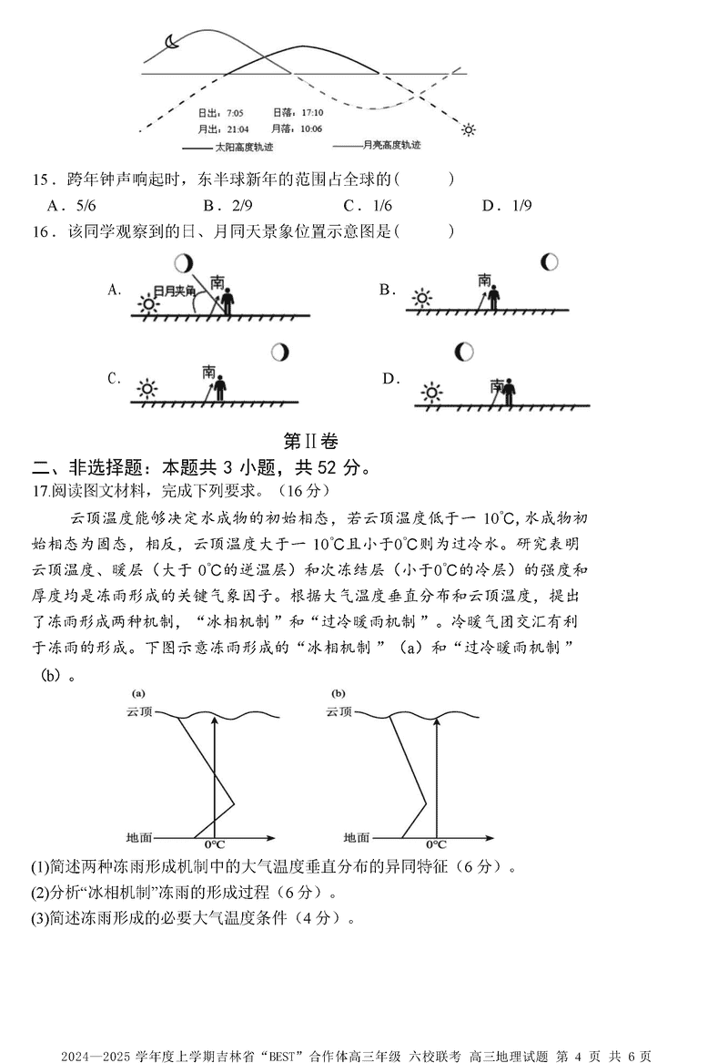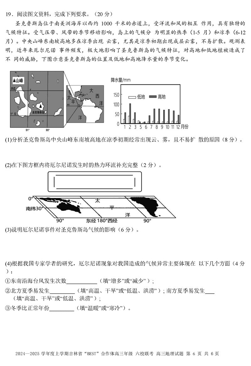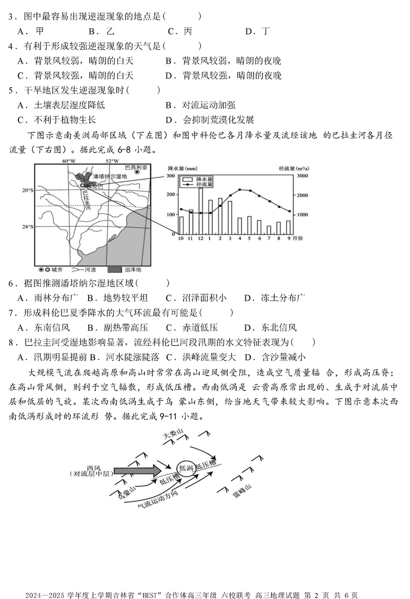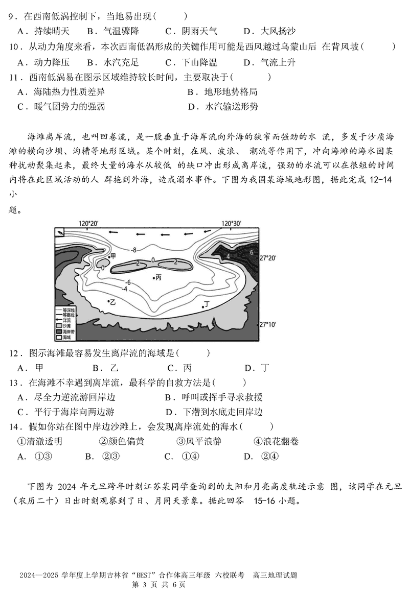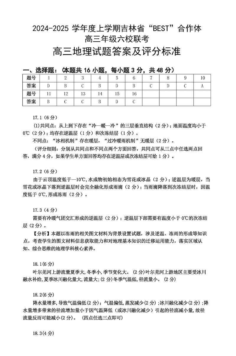 吉林BEST合作体六校2025届高三上学期第三次联考地理试题及答案