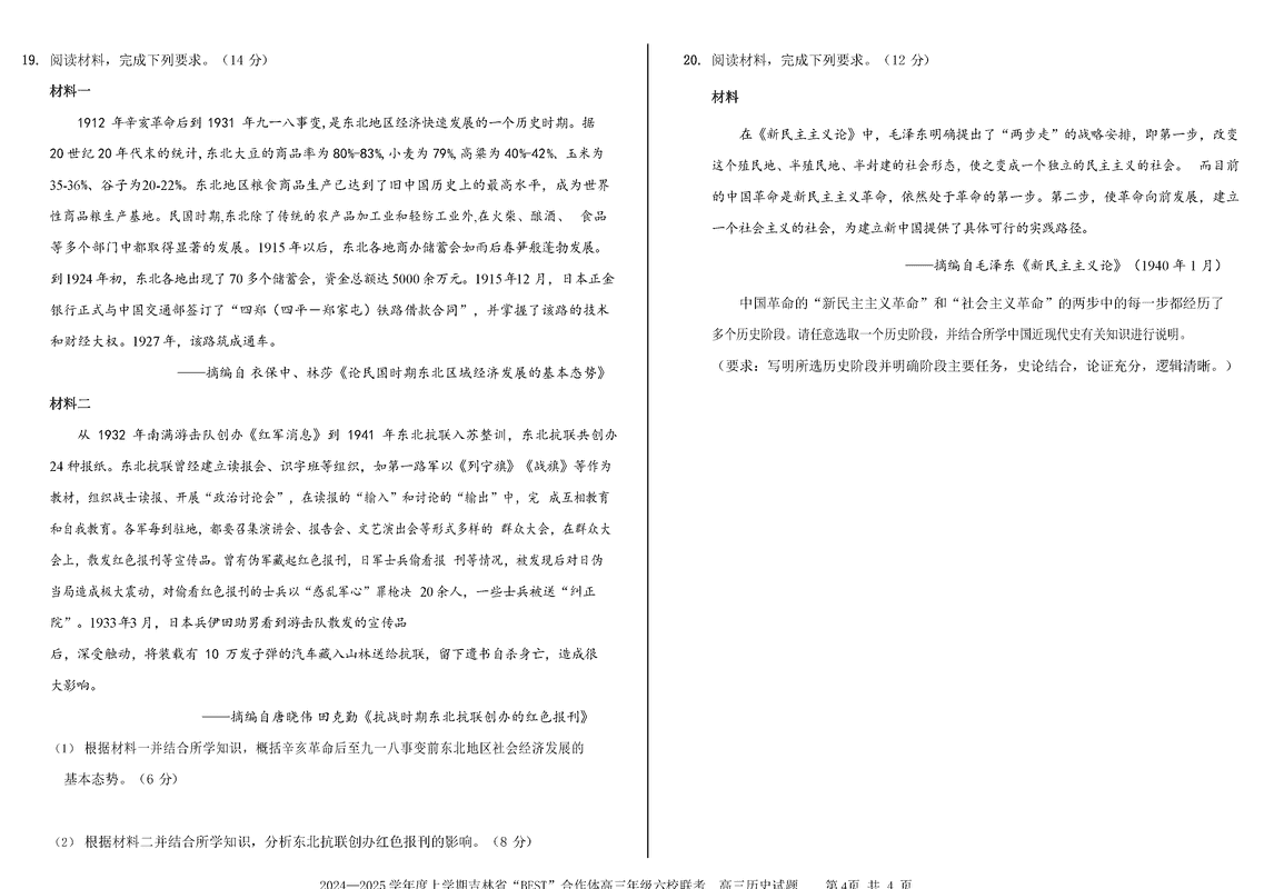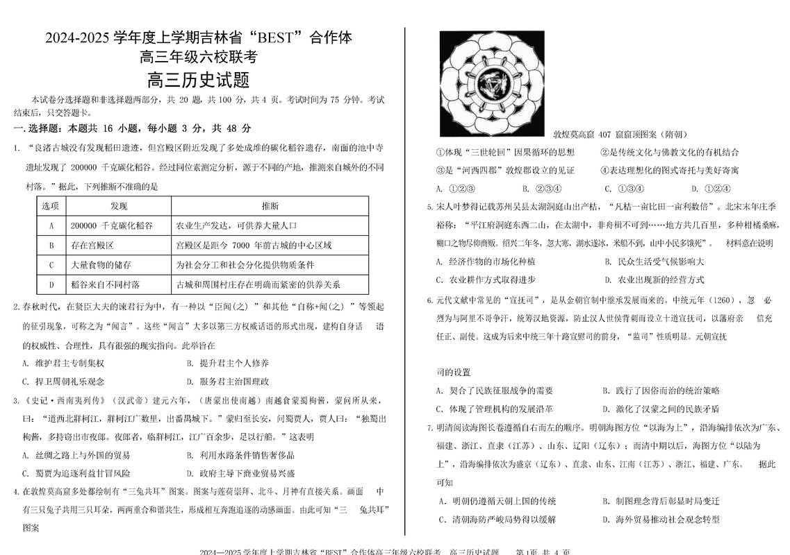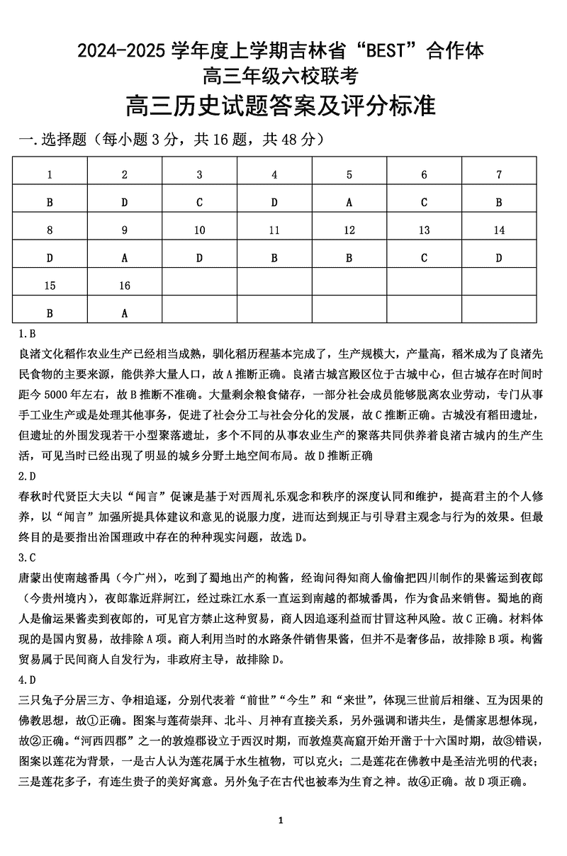 吉林BEST合作体六校2025届高三上学期第三次联考历史试题及答案