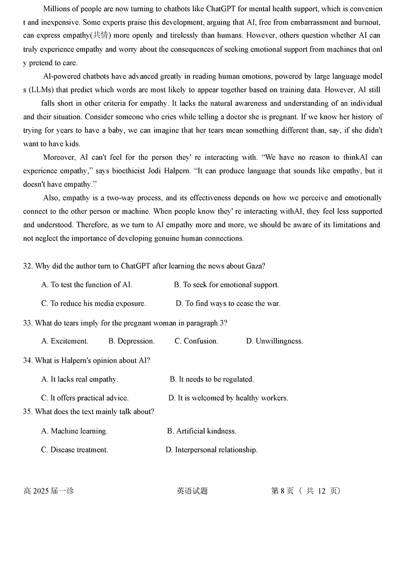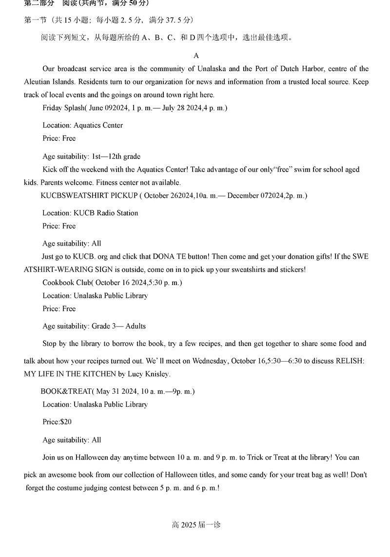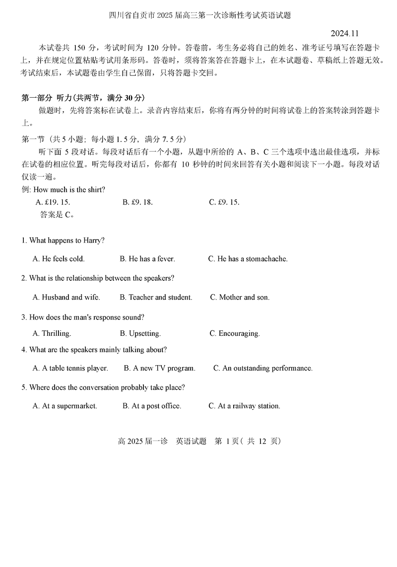 四川自贡普高2025届高三第一次诊断性考英语试题及答案